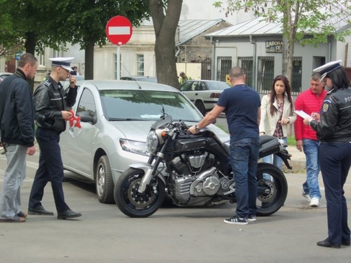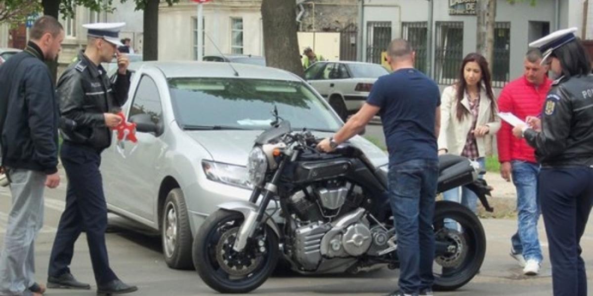 Coliziune între un autoturism "Dacia Logan" şi o motocicletă, din cauza neacordării de prioritate. Accidentul s-a produs ieri dimineaţă, la ora 10.25, la intersecţia Calea Galaţi cu Bulevardul Cuza. Potrivit poliţiştilor, brăileanca Roxana S., de 31 de ani, conducea autoturismul, venind dinspre Bălcescu şi îndreptându-se spre Bulevardul Sulina. Şoferiţa a intrat în sensul giratoriu fără să acorde prioritate motociclistului Claudiu D., de 29 de ani, din Brăila. În urma impactului, acesta a fost trântit la pământ, dar a scăpat cu leziuni uşoare. El a fost transportat la spital, pentru îngrijiri medicale, dar nu a rămas internat. Politiştii rutieri au efectuat cercetări şi i-au testat pe cei doi participanţi la trafic cu aparatul etilotest, rezultatele fiind negative. În cauză s-a întocmit dosar penal pentru vătămare corporală din culpă.