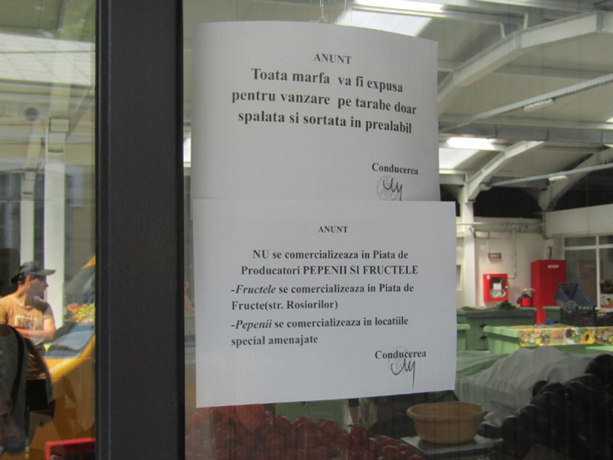 Direcția Administrației Piețelor și Târgurilor (DAPT) a încercat, încă de la inaugurarea noii hale în care funcționează Sectorul Producători din Piața Mare, să impună niște reguli. Astfel, conform afișelor lipite la vedere pe geamurile termopan ale clădirii date în folosință în urmă cu doar câteva zile, comercializarea fructelor și pepenilor nu este permisă în Piața de Producători. ”Fructele se comercializează în Piața de Fructe de pe strada Roșiori. Pepenii se comercializează în locațiile special amenajate”, se precizează pe afișul respectiv, sub semnătura conducerii DAPT. Cu toate acestea, în hala ”producătorilor”, de pe stada Griviței, s-au pus la vânzare, de la bun început, atât pepeni cât și fructe.