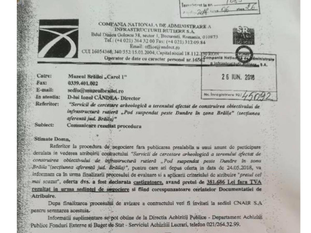 Muzeul Brăilei “Carol I” a fost desemnat câştigătorul procedurii de atribuire a unui contract privind serviciile de cercetare arheologică a terenului afectat de construirea obiectivului de infrastructură rutieră “Pod suspendat peste Dunăre în zona Brăila - Tulcea”, partea pentru capul de pod de pe raza judeţului nostru, după cum a anunţat pe propria pagină de Facebook preşedintele Consiliului Judeţean Brăila, Francisk Chiriac. În postarea respectivă este ataşată şi o adresă din partea autorităţii contractante (Compania Naţională de Administrare a Infrastructurii Rutiere - CNAIR) către instituţia brăileană prin care se face practic comunicarea rezultatului procedurii de achiziţie publică. Potrivit comunicării din partea CNAIR, metoda utilizată a fost negocierea fără publicarea prealabilă a unui anunţ de participare, criteriul de selecţie aplicat fiind “preţul cel mai scăzut”. Valoarea finală a contractului pentru descărcarea de sarcină arheologică a amplasamentului unde va fi realizat capul de pod de pe malul brăilean al Dunării este de 381.686 lei, fără TVA. “După finalizarea procesului de avizare a contractului veţi fi invitaţi la sediul CNAIR SA pentru semnarea acestuia”, se arată în adresa respectivă.