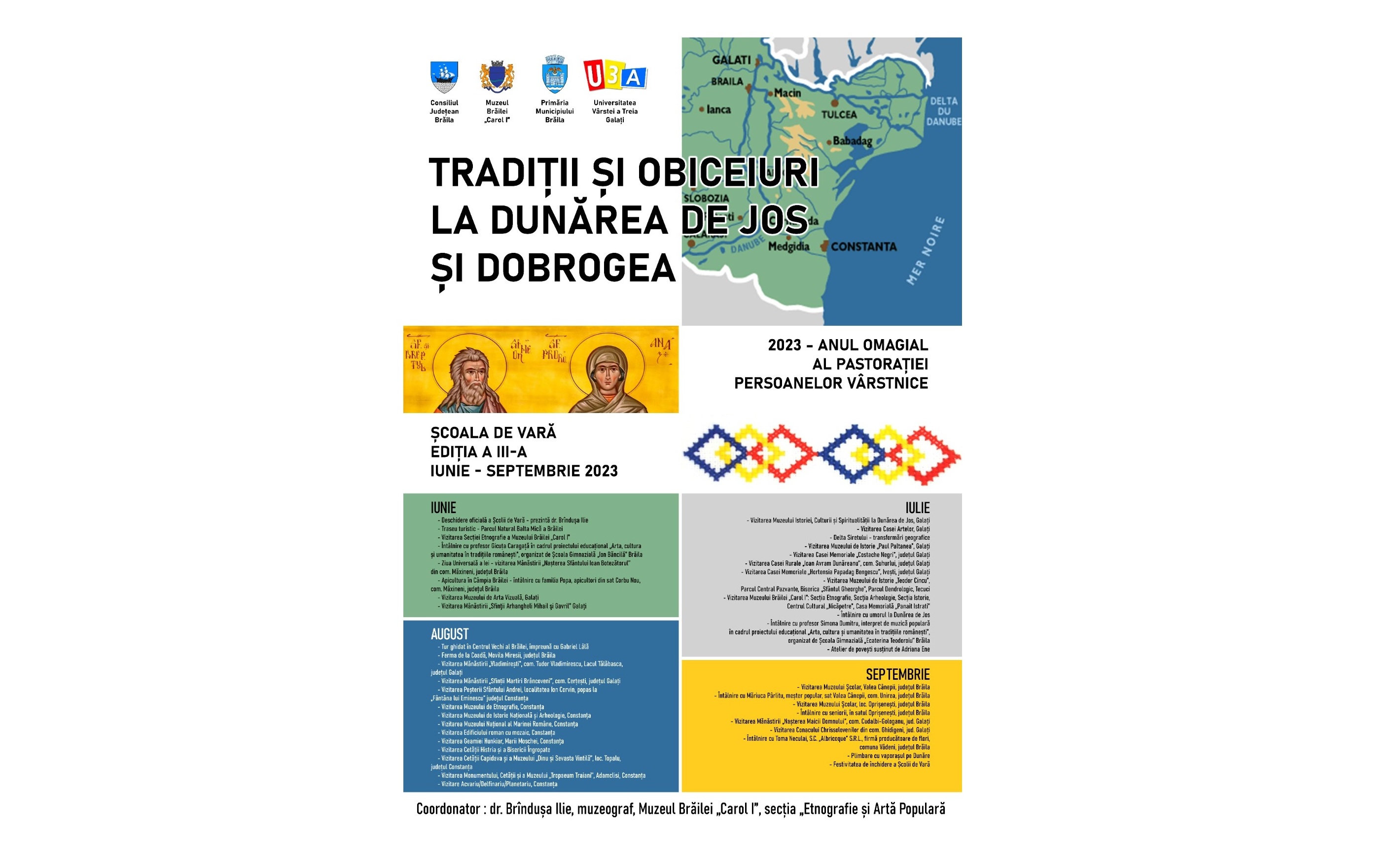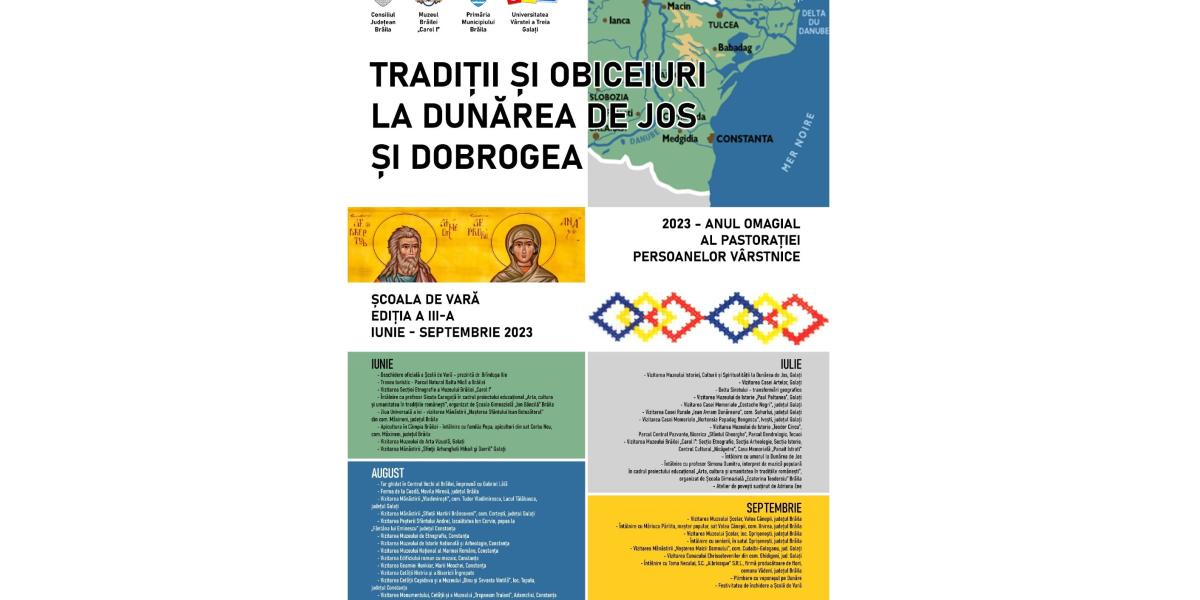 Muzeul Brăilei „Carol I”- Secția Etnografie și Artă Populară și Universitatea Vârstei a III-a din Galați organizează ediția a III-a a Școlii de Vară „Tradiții și obiceiuri la Dunărea de Jos și Dobrogea”, în „Anul omagial al pastorației persoanelor vârstnice”. Evenimentul este organizat în perioada iunie - septembrie 2023 în județele Brăila, Galați și Constanța, cu participarea studenților Universității Vârstei a III-a. Coordonator al Școlii de Vară este dr. Brîndușa Ilie, muzeograf la Muzeul Brăilei „Carol I”- Secția Etnografie și Artă Populară.