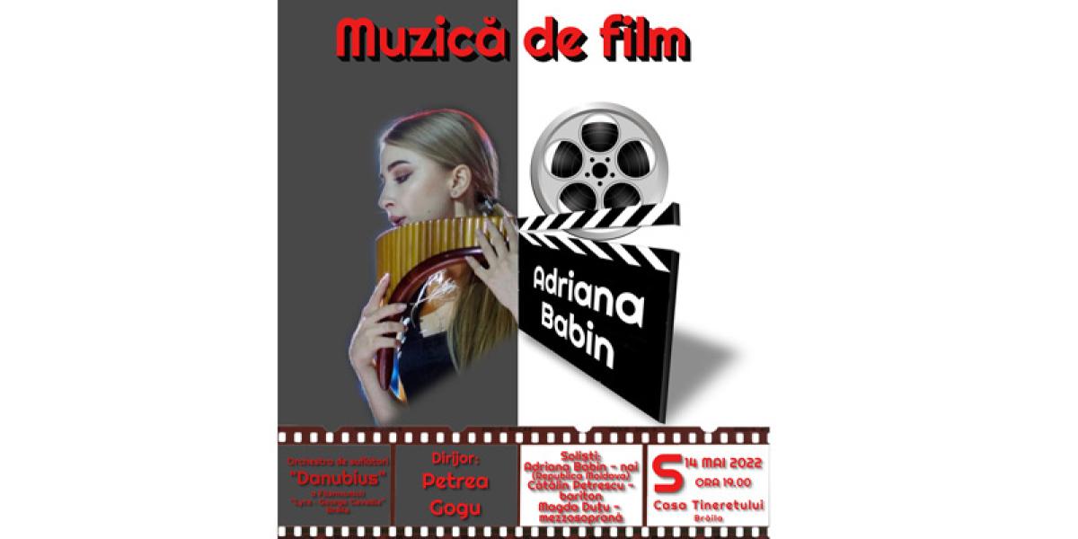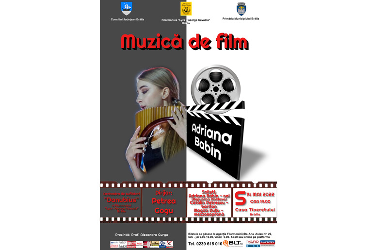 * sâmbătă, 14 mai, pe scena Casei Tineretului, are loc un excepțional concert de muzică de film * participă reputata naistă Adriana Babin, din Republica Moldova, baritonul Cătălin Petrescu, solist al Teatrului Național de Operetă ”Ion Dacian” București și mezzosoprana Magda Duțu * participă, de asemenea, Orchestra de suflători ”Danubius” a Filarmonicii ”Lyra-George Cavadia”, condusă de Petrea Gogu