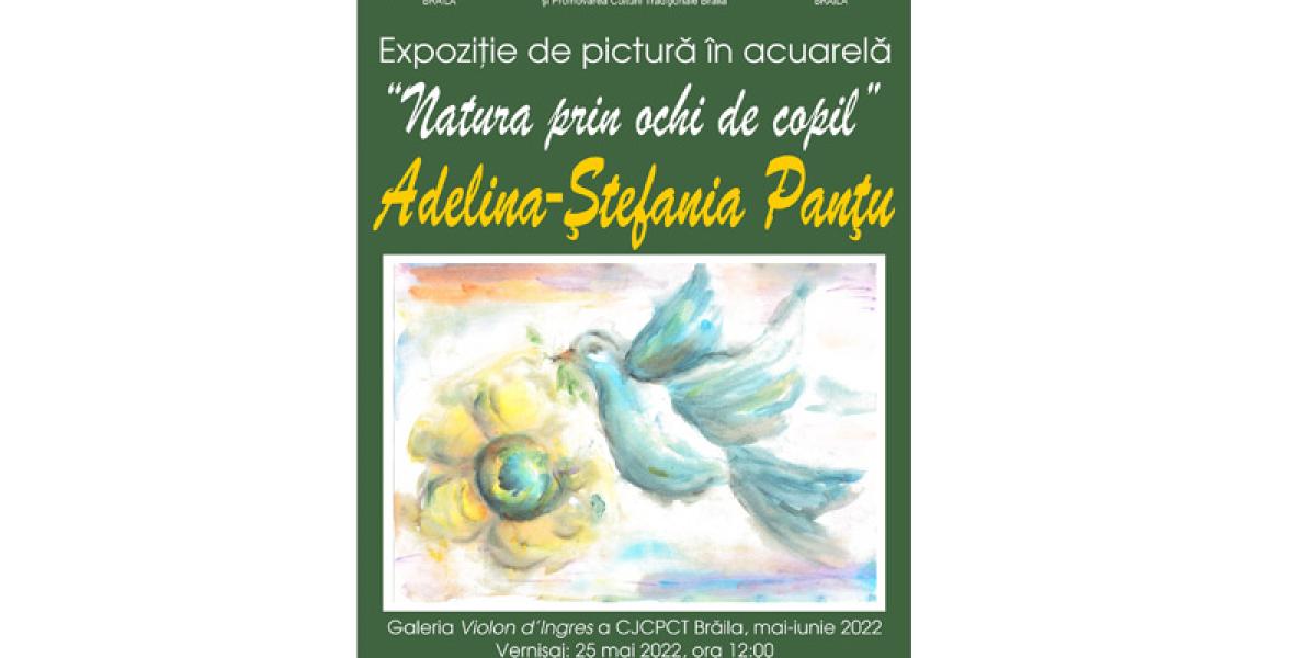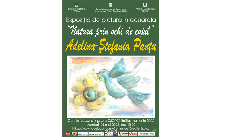 Astfel, Centrul Județean pentru Conservarea și Promovarea Culturii Tradiționale Brăila (Centrul de Creație), în parteneriat cu Primăria Municipiului și Consiliul Județean Brăila, organizează în ziua de miercuri, 25 mai a.c., de la ora 12.00, vernisajul expoziției de pictură în acuarelă intitulate "Natura prin ochi de copil", autor Adelina-Ștefania Panțu.