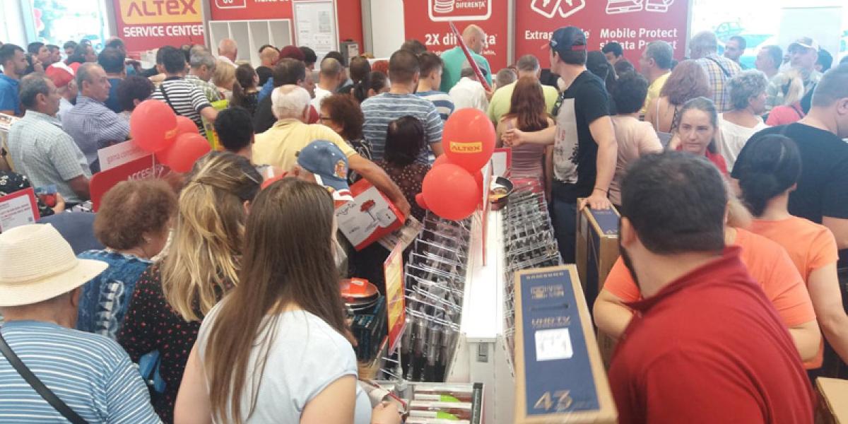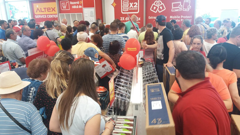 De exemplu, la deschiderea magazinului Altex din Brăila lumea s-a îmbulzit să pună mâna pe o tigaie cinstită, să aibă în ce prăji cartofii pai.