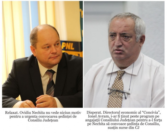 Pe surse, redactorii "Obiectiv" au aflat că amânarea convocării şedinţei de Consiliu Judeţean nu este deloc pe placul PSD-iştilor, în special a consilierului Ionel Avram care vânează fotoliul lui Nechita. Surse din cadrul Consiliului au declarat pentru "Obiectiv" că acesta i-a obligat pe angajaţii CJ să rămână vineri peste programul de lucru în încercarea de a-l forţa pe Nechita să convoace şedinţa CJ pentru data de luni, 1 septembrie. "Sunt disperaţi. Vor să-l dea jos pe Nechita pentru a bloca accesul la mizeriile pe care le-au făcut", a declarat pentru "Obiectiv", sub protecţia anonimatului, un funcţionar din cadrul CJ.