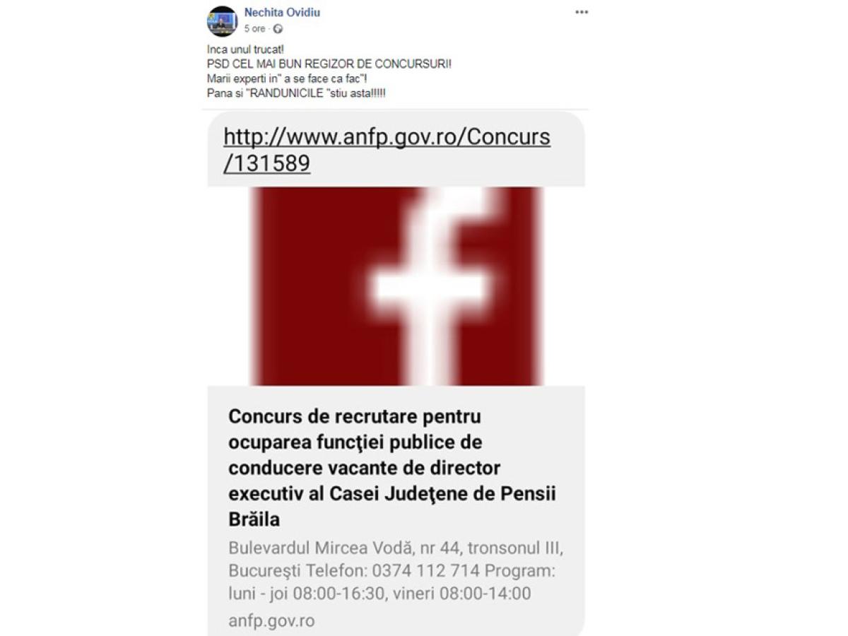 Abia a apărut informaţia conform căreia postul de director al Casei de Pensii Brăila va fi scos la concurs, după retragerea lui Sorin Enache, şi deja au apărut speculaţii. Liberalul şi consilierul judeţean Ovidiu Nechita a făcut o postare pe pagina sa de Facebook, în care susţine că procedura pentru ocuparea funcţiei de director al Casei Judeţene de Pensii (CJP) Brăila este una trucată. Acesta a bătut un apropo că actualul secretar de stat în Ministerul Muncii, social-democratul Marius Adrian Rândunică, ar urma să fie declarat “admis” la concurs şi, astfel, să devină noul director executiv al CJP. “Încă unul trucat! PSD cel mai bun regizor de concursuri! Marii experţi în «a se face că fac». Până şi «Rândunicile» ştiu asta!!!”, este postarea făcută de Nechita, vineri dimineaţă, pe reţeaua de socializare. Contactat telefonic, acesta ne-a declarat că “nu e vorba de Mama-Omida (aşa cum a fost poreclit de PSD-iştii brăileni, în trecut - n.r.), ci despre faptul că aceste concursuri sunt aranjate. Puteţi verifica celelalte concursuri despre care am vorbit la acea vreme şi o să vedeţi că pe cine am indicat că o să fie admis, acela a fost! Acum, nu vreau să dau nume pentru concursul la CJP, o să vedem cine va candida şi cine va câştiga!”.