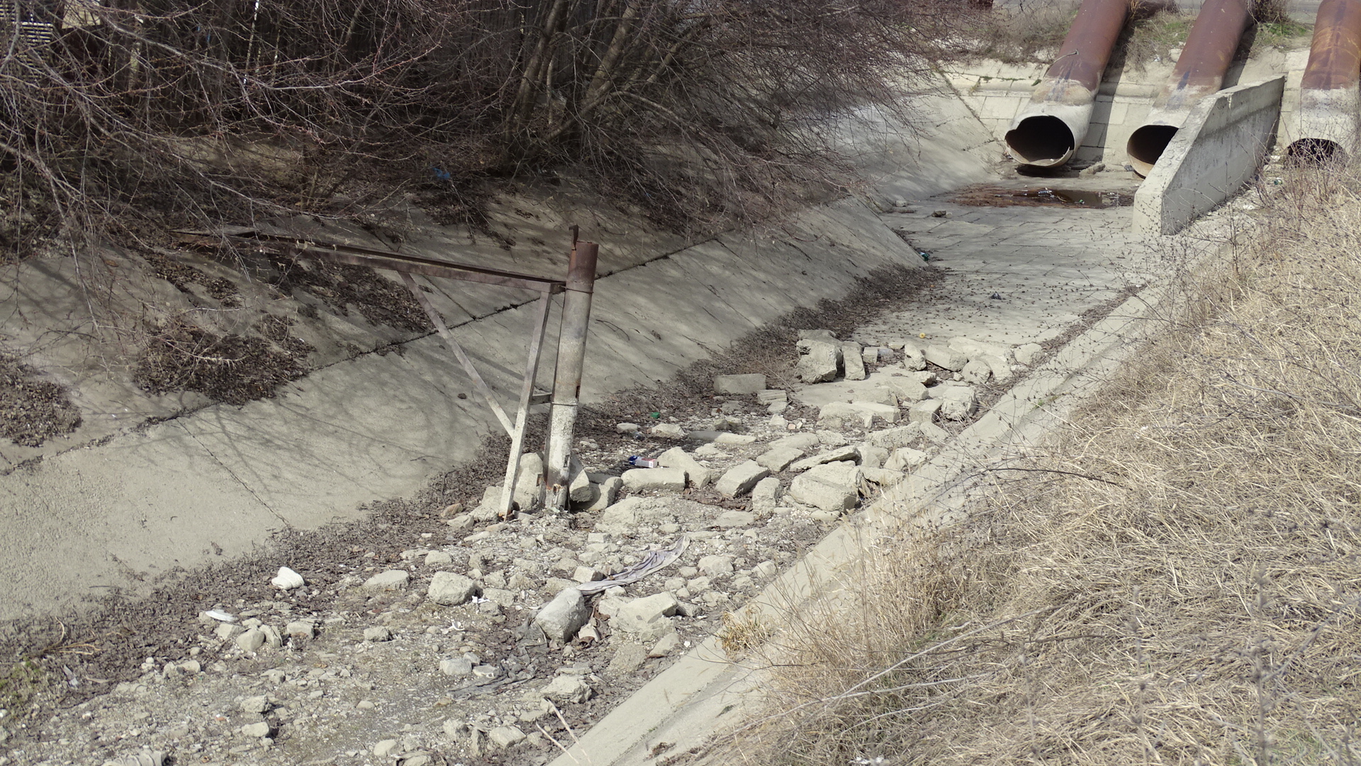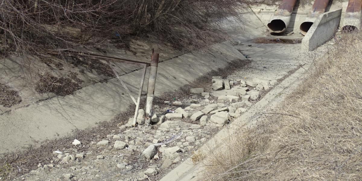 Revenind la traseul de la capătul liniei 2, alte necazuri: zeci de tone de pământ, bălării, asfalt “îngheţat”, piatră şi beton, lemn, recipienţi din plastic, deşeuri textile şi materiale inerte etc – toate aruncate de la marginea canalului şi până lângă o staţie de transformare electrică; gropi de împrumut săpate în jurul conductelor metalice ce vin de la SRP2. Deci, nici vorbă de respectarea a minimum 2 metri pentru zona de siguranţă şi intervenţii aparţinând ANIF. Iar situaţia se complică şi mai mult pe partea stângă de curgere a canalului, acolo unde s-au construit case (în proximitatea Depoului de tramvaie şi chiar mult mai departe). Nu știm dacă cineva a aprobat sau nu ca aceste curţi să fie extinse tot până în buza canalului. Care, după cum arată, are nevoie de remedieri serioase. Dar pe unde şi cum să ajungă ANIF şi firmele de profil cu utilajele pentru intervenţiile necesare?!
