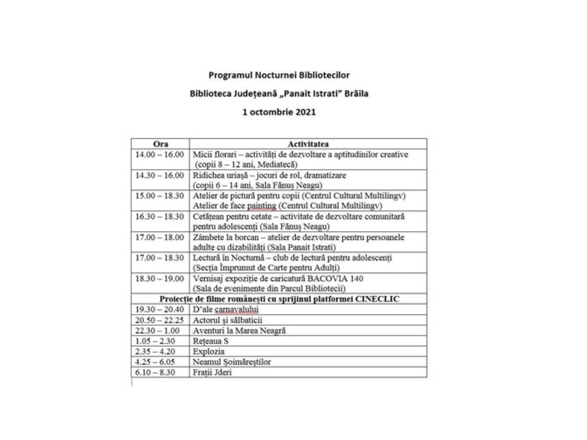 Programul “Nocturnei” oferit de Biblioteca Județeană “Panait Istrati” cuprinde următoarele activități:
