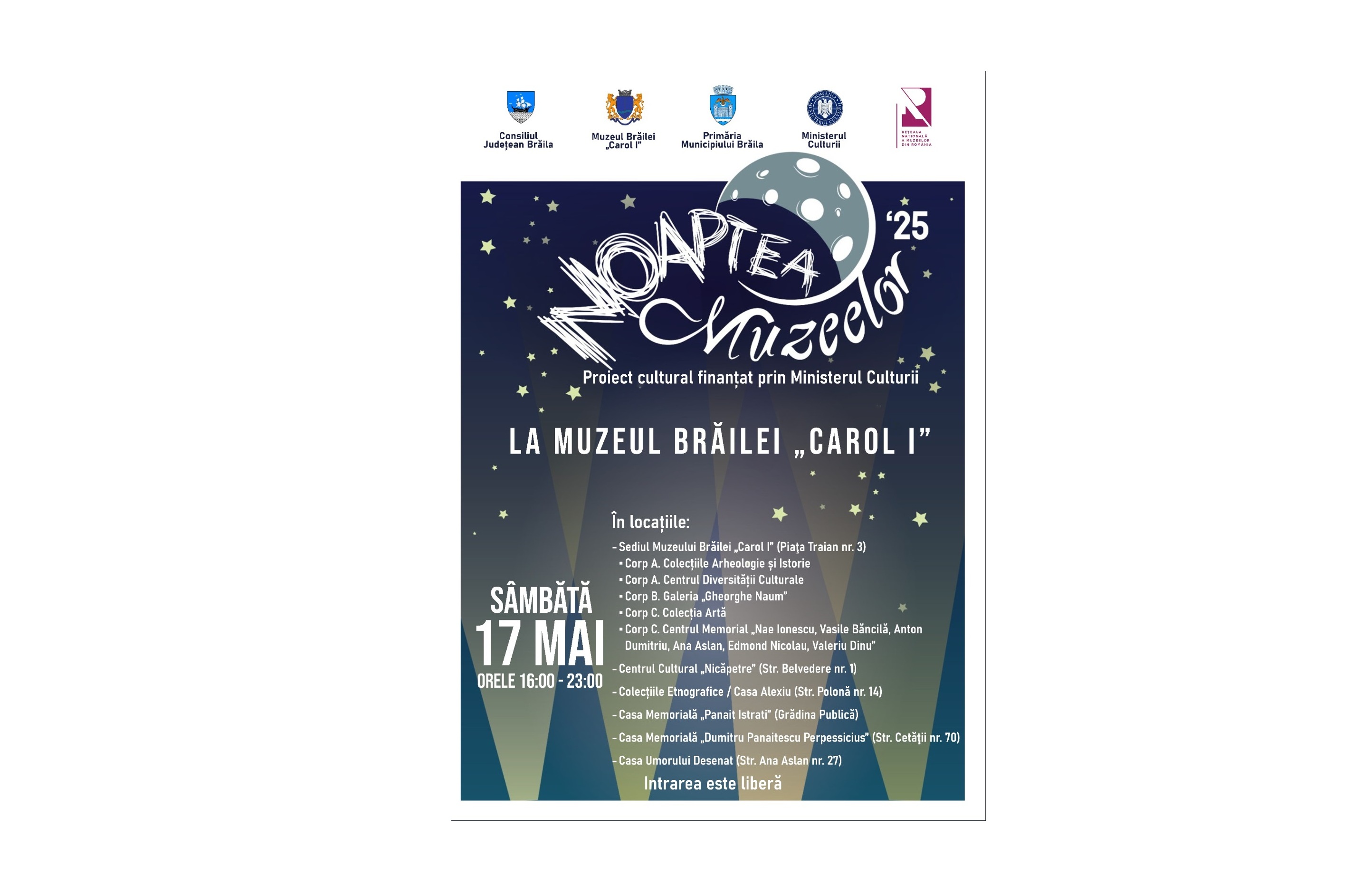 • Între orele 16.00 - 23.00: Vizitarea expoziției temporare „Centenar Romeo Voinescu”. Pictură, ilustrație și proiecte decorative din colecția Muzeului Brăilei „Carol I”. Curatori: Alina-Ruxandra Mircea, muzeograf – Serviciul Cercetare, Documentare, Valorificare și Fatme Nistoroi, muzeograf – Serviciul Relații cu Publicul.