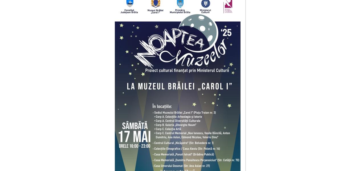 * sâmbătă, 17 mai, între orele 16:00 și 23:00, muzeografii brăileni, în parteneriat cu celelalte instituții de cultură din Brăila, școli și licee, dar și cu reprezentanții etniilor, au pregătit zeci de evenimente, care mai de care mai interesante * își dau concursul ansambluri de dansuri, soliști vocali, artiști plastici, meșteri populari, elevi ai Liceului de Artă „Darclee”, ai Școlii Populare de Artă, dar și Corul bărbătesc „Armonia” * intrarea este liberă