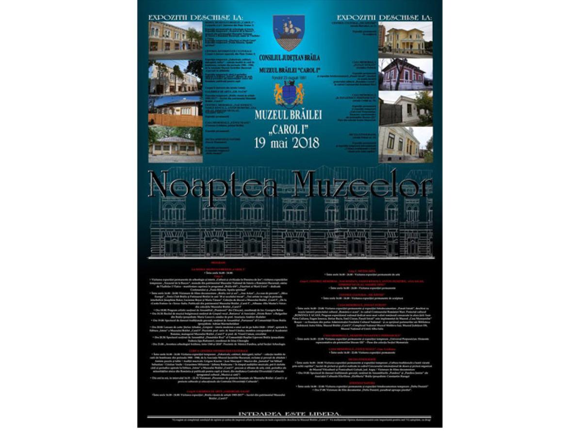 La Brăila, Noaptea Muzeelor, sărbătorită sâmbătă, 19 mai, în toată ţara, va începe la ora 16.00 şi se va derula până la orele 24.00 în toate spaţiile Muzeului de Istorie “Carol l”, cu o paletă diversificată de activităţi.