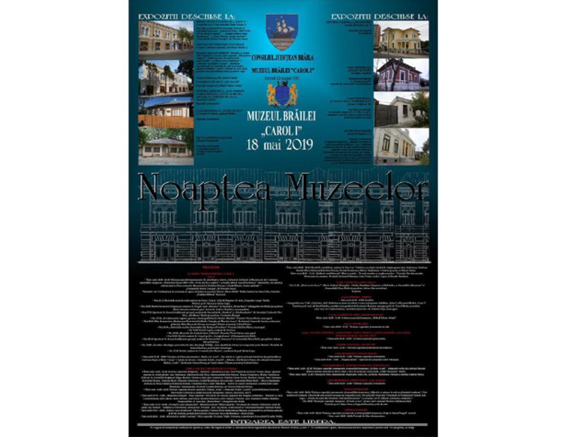 Astfel, la sediul Muzeului Brăilei, din Piaţa Traian nr.3, corp A în cadrul instituţiei, între orele 16.00 - 24.00, brăilenii pot participa la mai multe evenimente: Vizitarea expoziţiei permanente de arheologie şi istorie “Cultură şi civilizaţie la Dunărea de Jos”; vizitarea expoziţiilor temporare “Demostene Russo (1869-1939). 150 de ani de la naştere”; “Fondul cultural Anca Dumitrescu”; Memoriale, artă plastică, artă decorativă; Piese provenite din zestrea lui Nedelcu Chercea; “Paula Ribariu. Spaţiu spiritual”; “Portretul lui Barbu Catargiu”, de Theodor Aman.