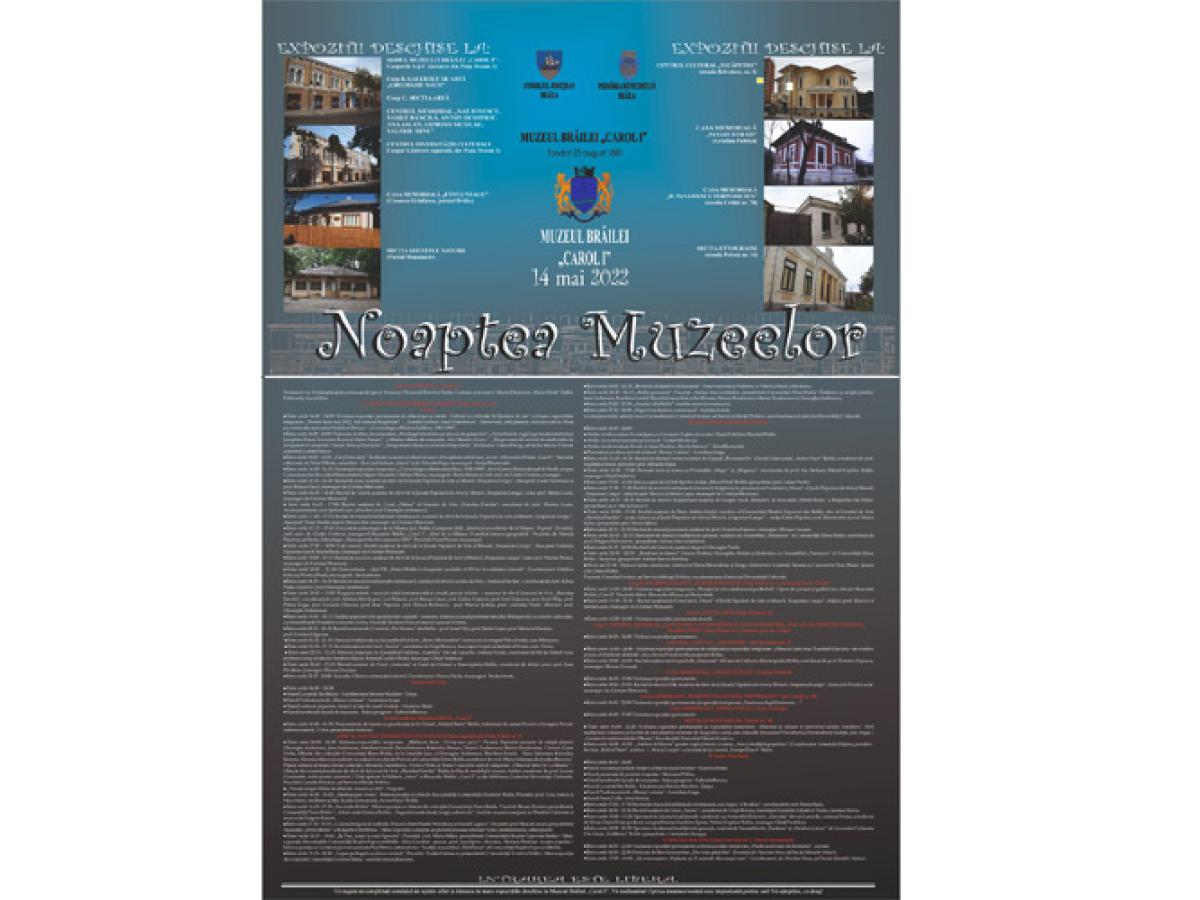 Potrivit comunicatului trimis de Muzeul Brăilei "Carol I", la sediul central al instituției, din Piața Traian nr. 3, se vor derula mai multe activități între orele 16.00-24.00, iar vizitatorii vor fi întâmpinați de personaje de epocă, cu ajutorul voluntarilor de la Forumul Tinerilor. Vor putea fi vizitate expozițiile permanente de arheologie și istorie de la parter și etaj, precum și cele de artă plastică, memoriale și artă decorativă, inclusiv obiecte care i-au aparținut filantropului Nedelcu P. Chercea. Vor putea fi vizionate filme documentare despre artiștii din perioada interbelică - inclusiv Josephine Baker, Lucienne Boyer și Maria Tănase, realizate de Ghena Pricop. Concomitent, sub genericul "Cărți între cărți", iubitorii de lectură se vor întâlni cu autori și editori ai unor volume apărute în Editura "Istros". Ghizi le vor fi dr. Viorel Mortu și dr. Valentin Popa.