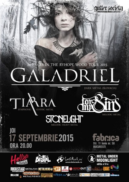 Veşti noi în privinţa concertului trupei de extreme dark metal din Slovacia, Galadriel, ce va avea loc pe 17 septembrie în Club Fabrica din Bucureşti, cu ocazia ediţiei 51 a Festivalului Metal Under Moonlight. Alături de Tiarra (gothic metal din Bucureşti), alte două trupe din capitală vor urca pe scenă, în deschiderea slovenilor. Este vorba despre StoneLight şi For My Sins. Abordând un gen muzical care poate fi caracterizat drept un crossover de melodic heavy metal ce include influenţe progresive şi elemente epice, StoneLight a fost permanent o prezenţă dinamică pe scena autohtonă. Show-ul grupului din data de 17 septembrie merită bifat deoarece va fi ultimul alături de chitaristul Alex Mezei, dar şi cel în care vor prezenta un nou membru. Cât despre For My Sins, trupa a luat naştere din dorinţa fondatorilor ei de a oferi o nouă abordare a metalului. Prin îmbinarea agresivităţii cu părţile melodice, în urmă cu un an formaţia începea să ia cu asalt scenele cluburilor din România. "Vocea solistei combină elemente de pop rock cu o melodicitate şi o atitudine pasională, prezenţă greu de ignorat. Plecând de la furie, dezolare şi anxietate, ajungând la încredere şi optimism, temele abordate sunt menite să ofere ascultătorului o trăire cât mai completă a naturii umane", declară organizatorii evenimentului.