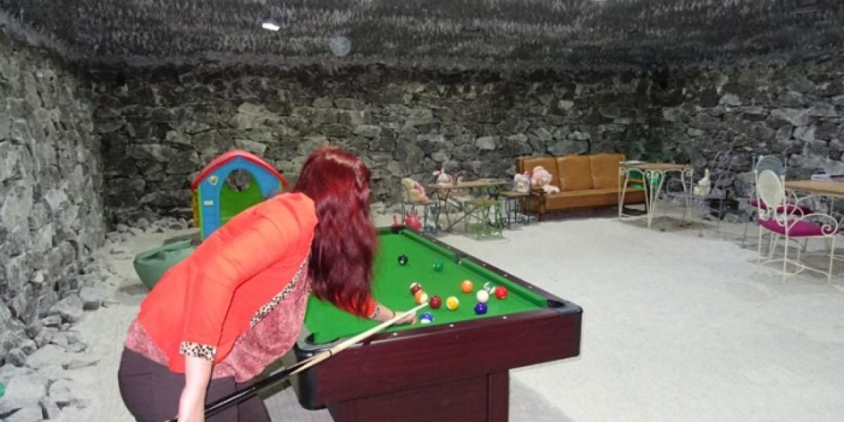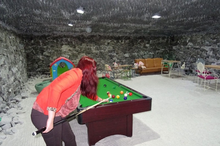 Pentru ca şedinţele între pereţii din bulgări de sare să treacă mai repede şi într-un mod cât mai plăcut, clienţii se pot destinde la partide de biliard. O masă nouă a fost achiziţionată de către firma "Cunax Com" SRL, cea care a câştigat licenţa pentru construirea salinei în Brăila.
