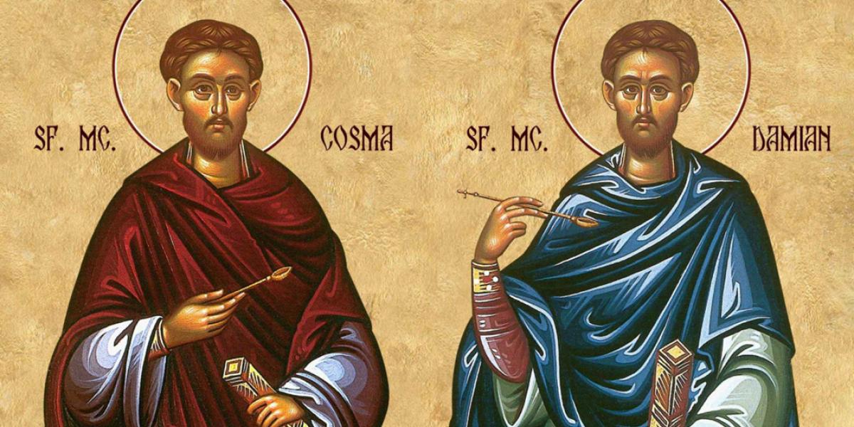 Sfinții Doctori fără de arginți Cosma și Damian (1 noiembrie) au fost doi frați din Efes, Asia Mică, care au trăit în secolul al IV-lea. Aceștia au fost crescuți în spiritul credinței creștine de mama lor evlavioasă, Teodota. Au studiat mai multe științe, dar au ales să practice medicina. În paralel, au urmat misiunea apostolilor, aceea de a propovădui Evanghelia Lui Hristos. Au primit darul de a alunga duhurile necurate și de a vindeca bolile fără a folosi leacuri, ci doar rugăciunea și numele Lui Hristos. Cosma și Damian îi tămăduiau pe toți oamenii, indiferent de condiție socială, fără a cere nimic în schimb, fiind cunoscuți drept „doctori fără de arginți”. Mila și credința lor erau atât de mari, încât tămăduiau și animalele. Ei au continuat să aducă vindecare credincioșilor în biserica zidită pe locul mormântului lor, prin sfintele moaște și prin icoana lor.