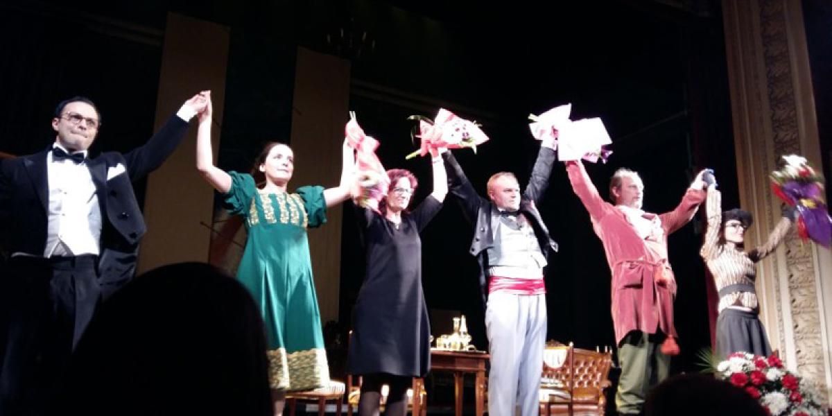 Un teatru cu decoruri frumoase, alcătuite din fotolii din piele, măsuţe cu lumânări şi candelabre. Un teatru cu minunate costume de epocă şi cu tablouri care trimit, cred, la pictorul Marc Chagall. Un adevărat răsfăţ pentru ochiul spectatorului.