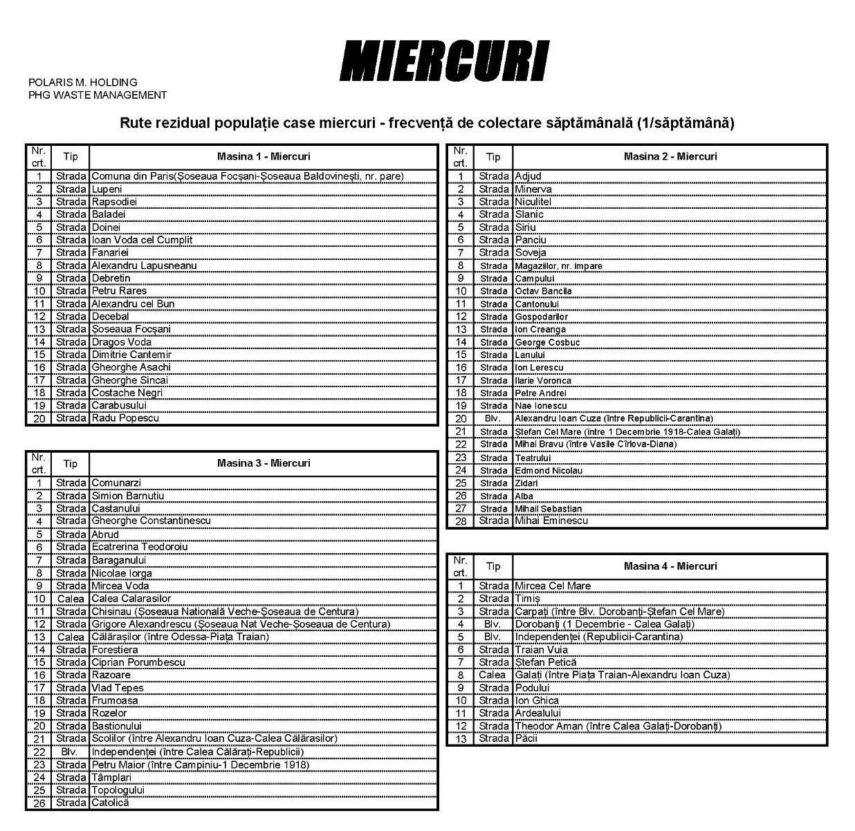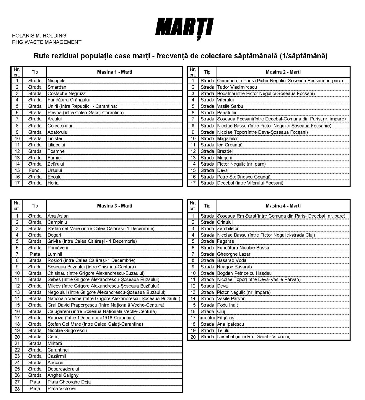 • săptămâna aceasta încă se mai fac angajări de personal și se mai completează parcul auto, astfel încât, de săptămâna viitoare, să se poată lucra în ritm normal • redăm mai jos cum se face colectarea, pe zile și străzi, conform tabelelor distribuite public de primarul Marian Dragomir