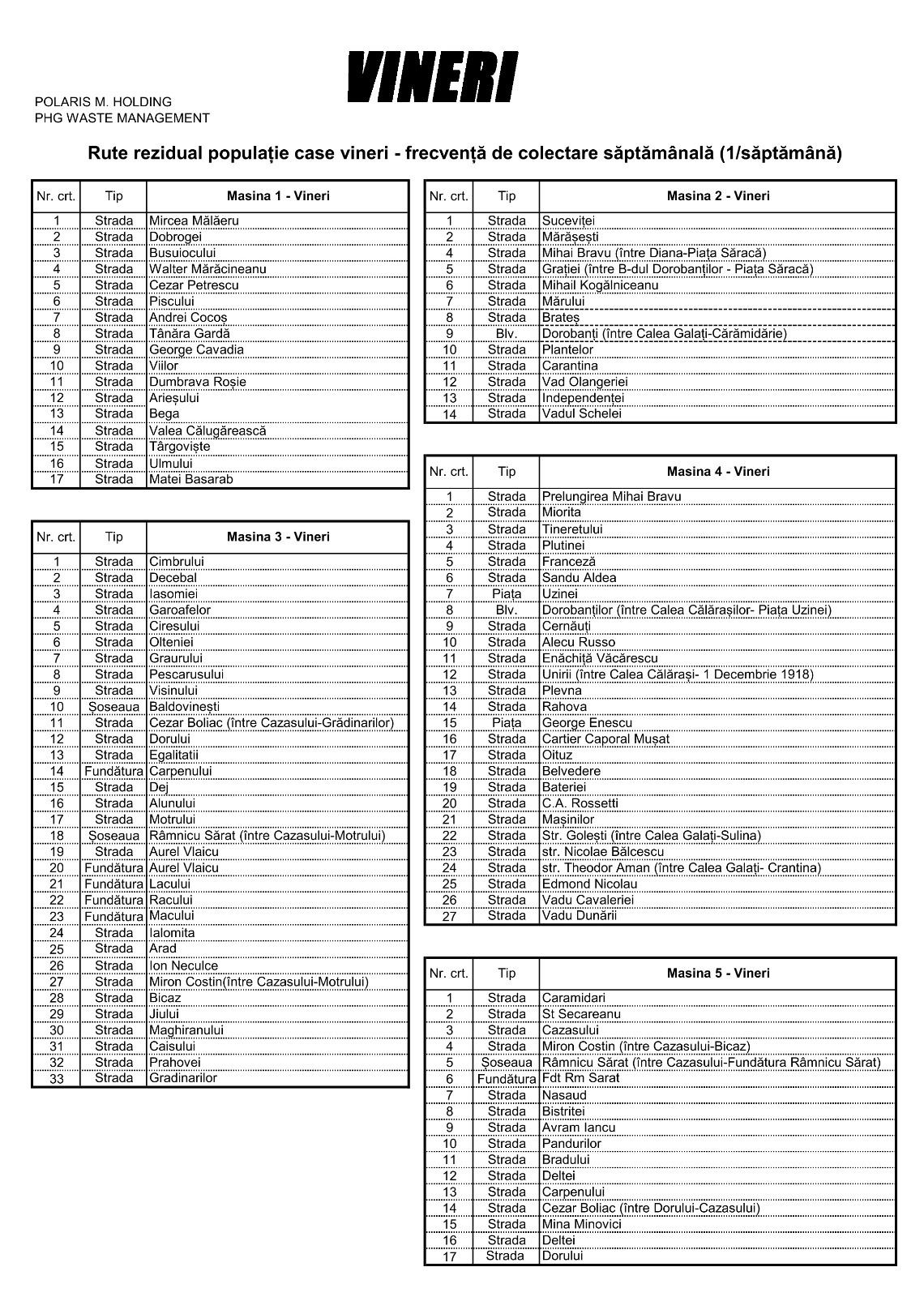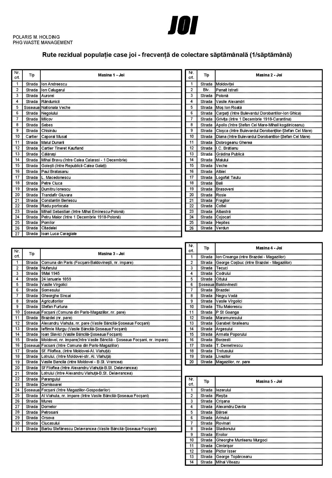 Firma Polaris M Holding, care a câștigat licitația organizată în regim de urgență de autoritatea care reprezintă toate primăriile din județ - ADI ECO Dunărea Brăila, a început activitatea încă de la sfârșitul săptămânii trecute, reușind să colecteze deșeurile din cartierele de blocuri din municipiu. De luni, 24 iunie, s-a intrat și în cartierele de case, unde se colectează, deocamdată, doar deșeurile menajere. Primarul Marian Dragomir precizează că firma Polaris încă mai face angajari și urmează să își completeze și parcul de mașini, astfel încât, de săptămâna viitoare, să se poată intra în ritm normal, cu colectarea pe fracții separate a deșeurilor: menajer și reciclabil, așa cum brăilenii erau deja obișnuiți. Primarul a făcut public, pe pagina sa de Facebook, și programul de colectare, pe străzi, în fiecare zi a săptămînii. Acest program va rămâne valabil și săptămânile viitoare, a precizat edilul-șef. Publicăm și noi aceste tabele, pentru ca toți brăilenii să știe în ce zi trec mașinile de salubritate pe strada de domiciliu a fiecăruia.