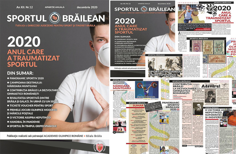 “Numărul 12 este unul cu totul special fiindcă reflectă un an aproape imposibil pentru sportul brăilean. Cu titlul de fond “2020 - ANUL CARE A TRAUMATIZAT SPORTUL”, publicația oferă un conținut tematic dedicat pandemiei, și anume: Panoramic sportiv 2020, Anul care a traumatizat sportul, Tichete voucher pentru sport, Handbal în pandemie, articole inedite și captivante care surprind povești unice despre sport. Primele Jocuri Olimpice și mărcile poștale, Campioana destinului, Mărioara Munteanu, O victorie asupra neputinței, recursuri la memoria colectivă, Contribuția Brăilei la dezvoltarea gimnasticii românești, Rivalitatea sportivă dintre Brăila și Galați în urmă cu un secol, sunt alte articole interesante din cuprinsul revistei. Fiind o inițiativă unică pe plan național, revista “Sportul Brăilean” îmbogățește peisajul publicațiilor locale dar de această dată se străduiește să aducă și un strop de optimism, de încurajare pentru sportul brăilean care a suferit cea mai puternică depresie de la ultima conflagrație mondială. Publicația va fi distribuită gratuit la evenimente sportive și la festivitățile de premiere de la activitățile și competițiile sportive proprii”, a precizat Mircea Carbunaru, coordonatorul publicației.