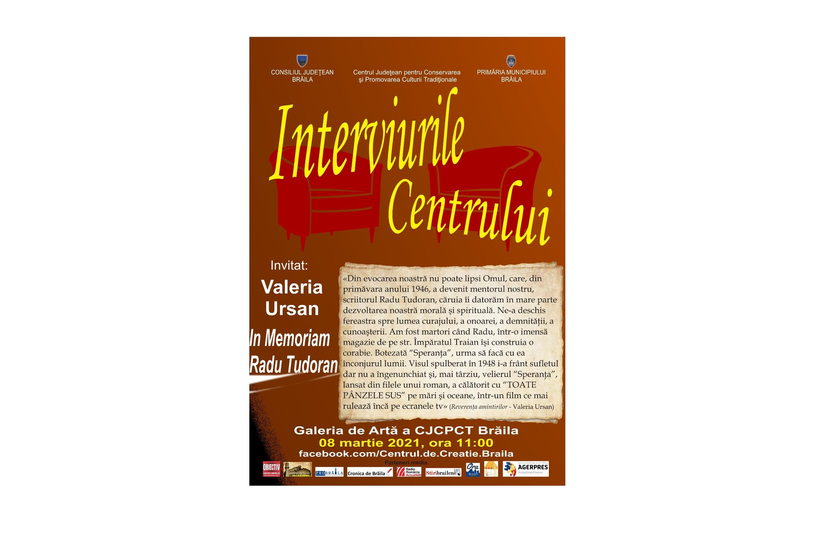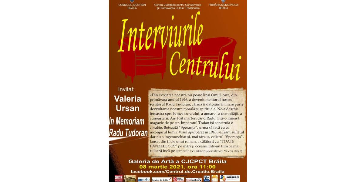 Astăzi, 8 martie, de la ora 11.00, la Interviurile Centrului, organizate de Centrul Județean pentru Conservarea și Promovarea Culturii Tradiționale Brăila, invitatul special al emisiunii este Valeria Ursan, discipolul marelui scriitor Radu Tudoran.