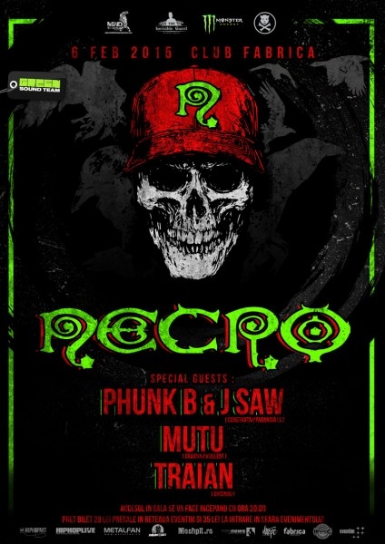Rapperul american Necro va urca, vineri, pe scena din Club Fabrica, Bucureşti. Cu o activitate de peste 20 de ani, Necro, pe numele său adevărat Ron Raphael Braunstein a şocat scena rap atât prin colaborările cu membrii trupelor metal Nuclear Assault, Anthrax, Testament, Obituary sau Slipknot, dar şi prin stilul său întunecat, fiind supranumit cel mai metal rapper sau "King of Death Rap". Acesta revine în România după mai bine de 6 ani pe data de 6 februarie, cu ocazia unui concert care face parte din turneul european "The Terminator Tour - I m Back". Pe lângă România, turneul acestuia mai cuprinde ţări precum: Franţa, Austria, Germania, Anglia, Bulgaria şi Italia. Trebuie precizat că Necro a activat în perioada 1986 - 1990 ca şi chitarist în trupa de death metal Injustice din Statele Unite, alături de fratele său ILL Bill, de asemenea cunoscut pe scena rap americană.