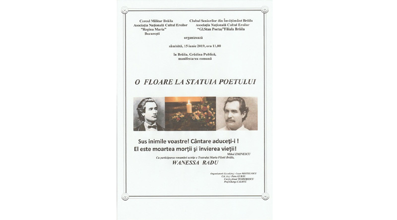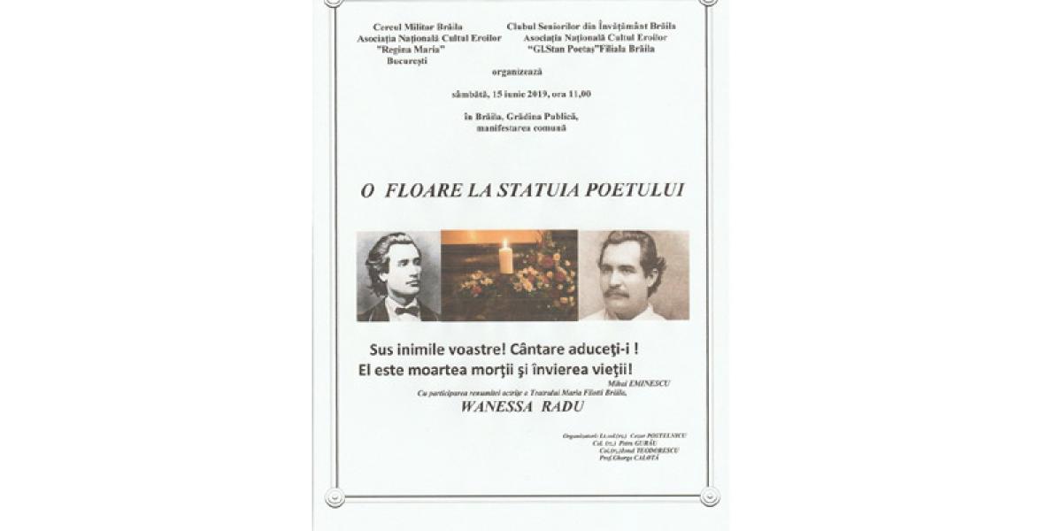 Sâmbătă, 15 iunie 2019, de la ora 11,00, în Grădina Publică din Brăila va avea loc manifestarea “O floare la statuia Poetului”, închinată împlinirii a 130 de ani de la trecerea între aştri a Poetului naţional, Mihai Eminescu.