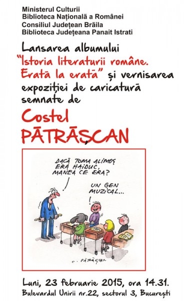 Vernisajul va avea loc luni, 23 februarie, la ora 14.30, la mezaninul Bibliotecii Naţionale, iar bibliotecarii brăilenii, organizatorii expoziţiei, promit că bucureştenii prezenţi vor experimenta, alături de Costel Pătrăşcan şi invitaţii lui, cel mai frumos şi plăcut mod de a începe o nouă săptămână.