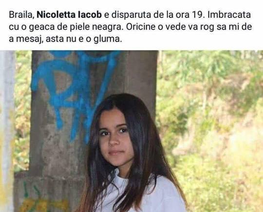 Potrivit poliţiştilor, vineri seara, la ora 21.00, Iacob Nicoleta, din Brăila, a fost dată dispărută de mama sa. Minora a plecat în mod voluntar de acasă, vineri, în jurul orei 18.30, şi nu a mai revenit. Poliţiştii au transmis rugămintea de a fi mediatizat cazul, fiind transmisă şi poza fetei. Azi-noapte, în jurul orei 2.00, dispăruta a decis să revină acasă. Ea fusese văzută prin cartierul Chercea, potrivit unor postări de pe Facebook. Fata locuiește însă în cartierul Radu Negru. Poliţiştii au precizat că minora nu a fost victima vreunei infracţiuni.