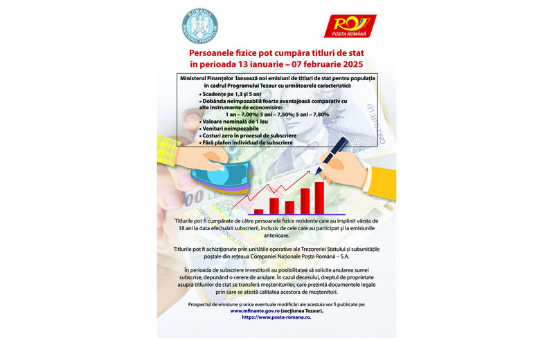 Prospectul de emisiune și orice eventuale modificări ale acestuia sunt publicate la secțiunea Datorie publică, www.posta-romana.ro.