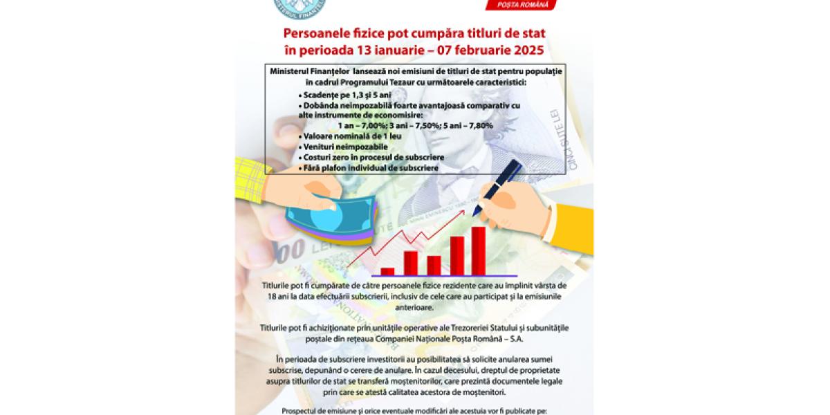 Românii pot investi, începând cu 13 ianuarie, în titlurile de stat TEZAUR, cu maturități de 1, 3 și 5 ani, cu dobânzi anuale de 7%, 7,5% și, respectiv, 7,8%. Titlurile de stat au valoare nominală de 1 leu și sunt în forma dematerializată.