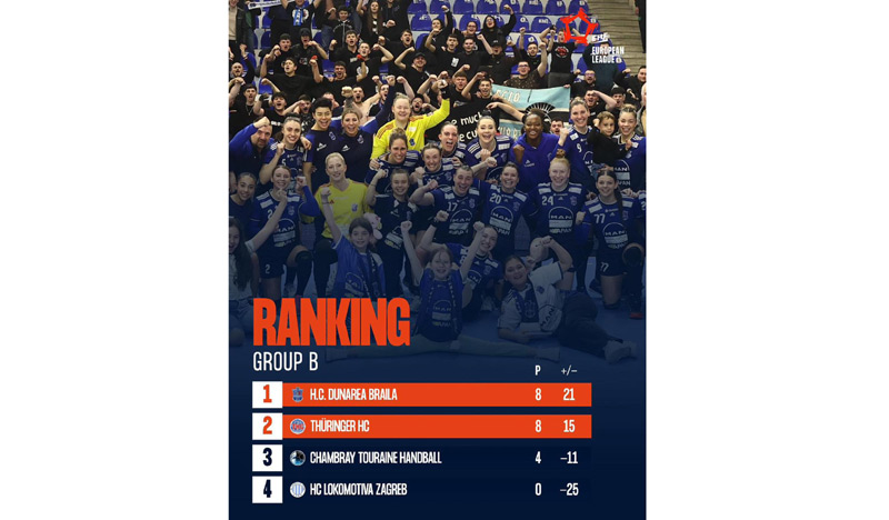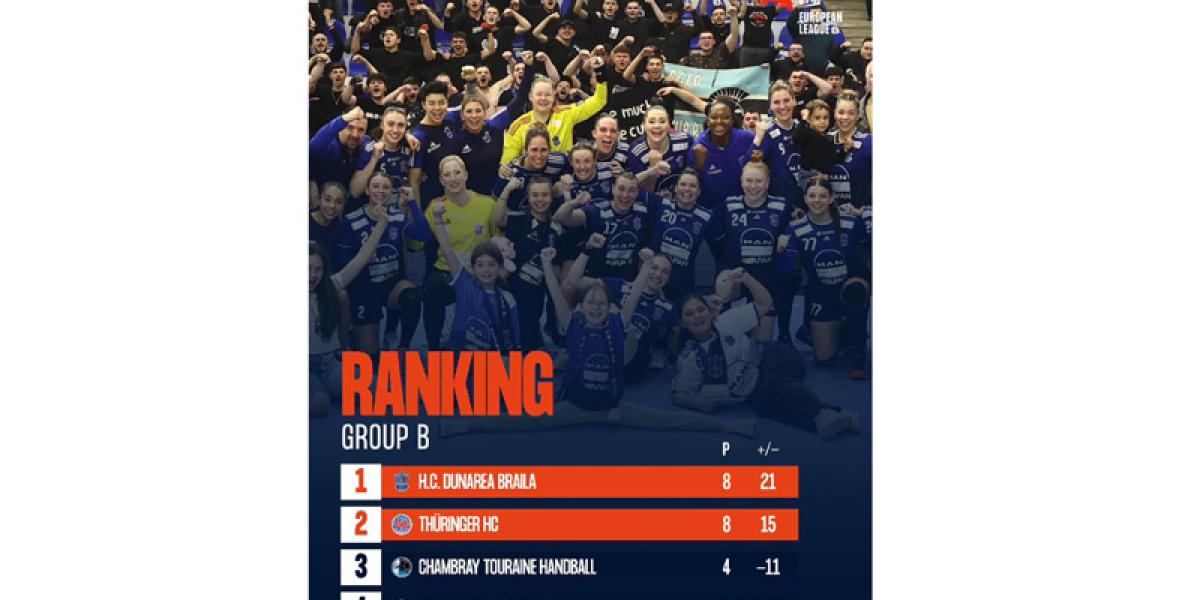 • formația pregătită de Jan Leslie a câștigat Grupa B a EHF European League după succesul cu 24-19 în deplasare, la Chambray Touraine Handball • Trusova a fost MVP-ul meciului • în sferturile de finală ale competiției europene, HC Dunărea o va întâlni într-o dublă manșă pe HC Podravka Vegeta