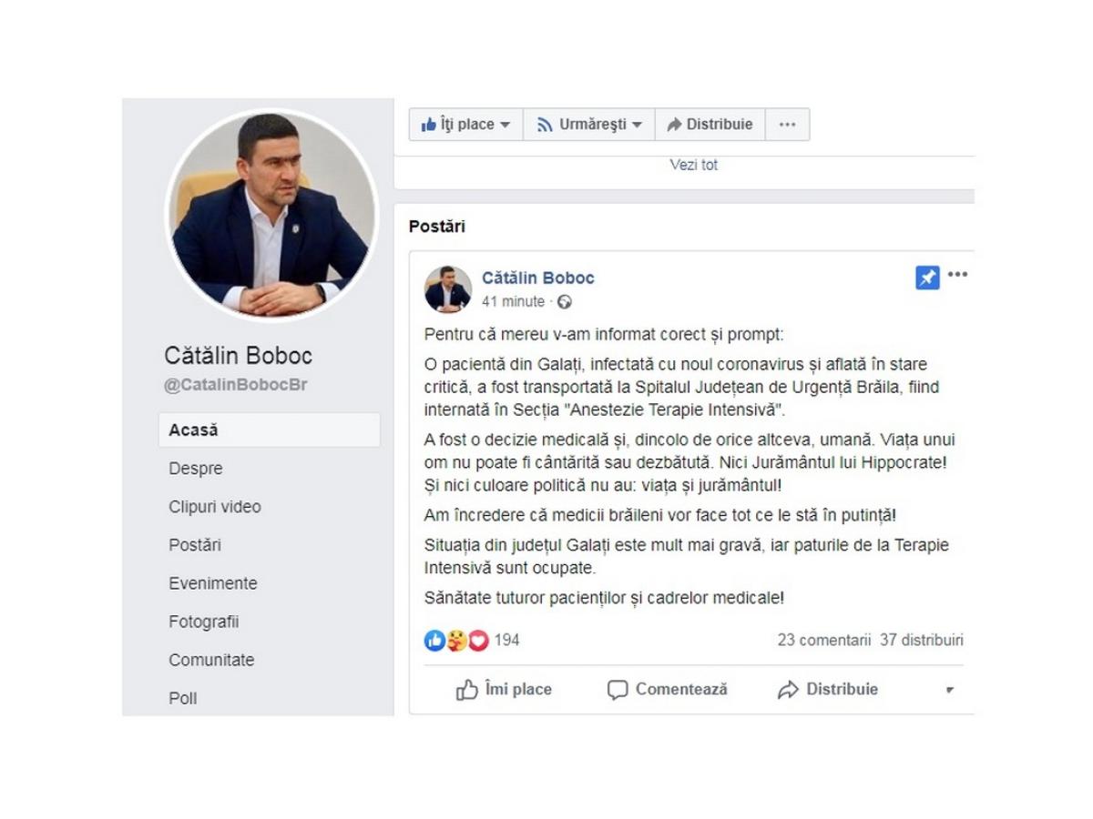 ”Pentru că mereu v-am informat corect și prompt: O pacientă din Galați, infectată cu noul coronavirus și aflată în stare critică, a fost transportată la Spitalul Județean de Urgență Brăila, fiind internată în Secția «Anestezie Terapie Intensivă». A fost o decizie medicală și dincolo de orice altceva, umană. Viața unui om nu poate fi cântărită sau dezbătută. Nici Jurământul lui Hippocrate! Și nici culoare politică nu au: viața și jurământul! Am încredere că medicii brăileni vor face tot ce le stă în putință! Situația din județul Galați este mult mai gravă, iar paturile de la Terapie Intensivă sunt ocupate. Sănătate tuturor pacienților și cadrelor medicale!”, a declarat Boboc, pe pagina sa de Facebook.