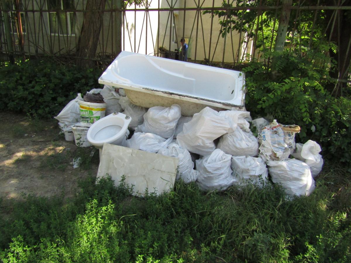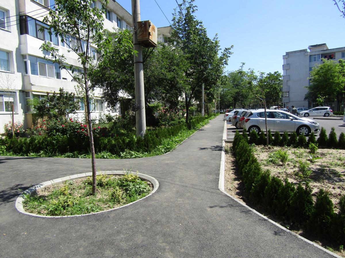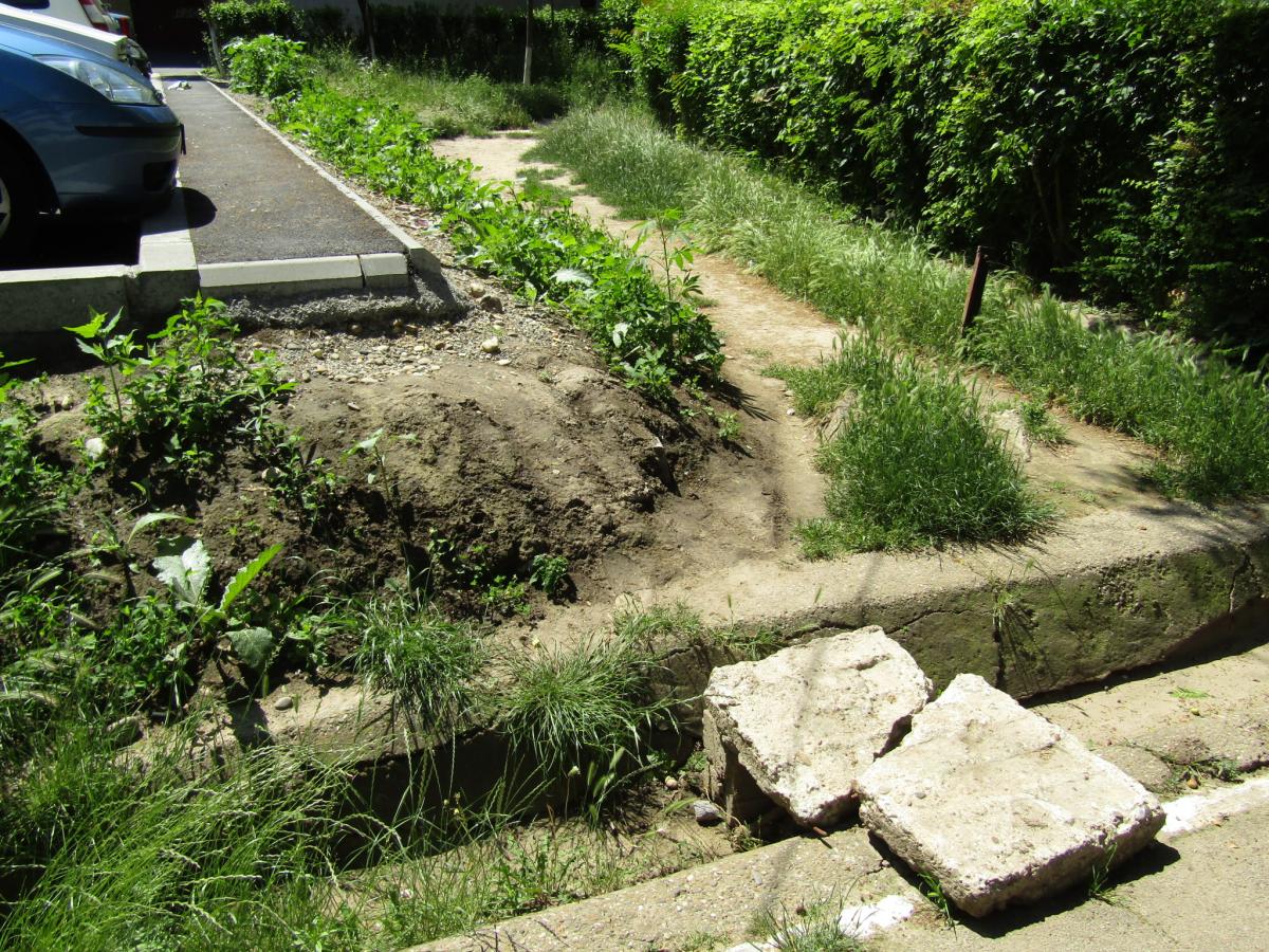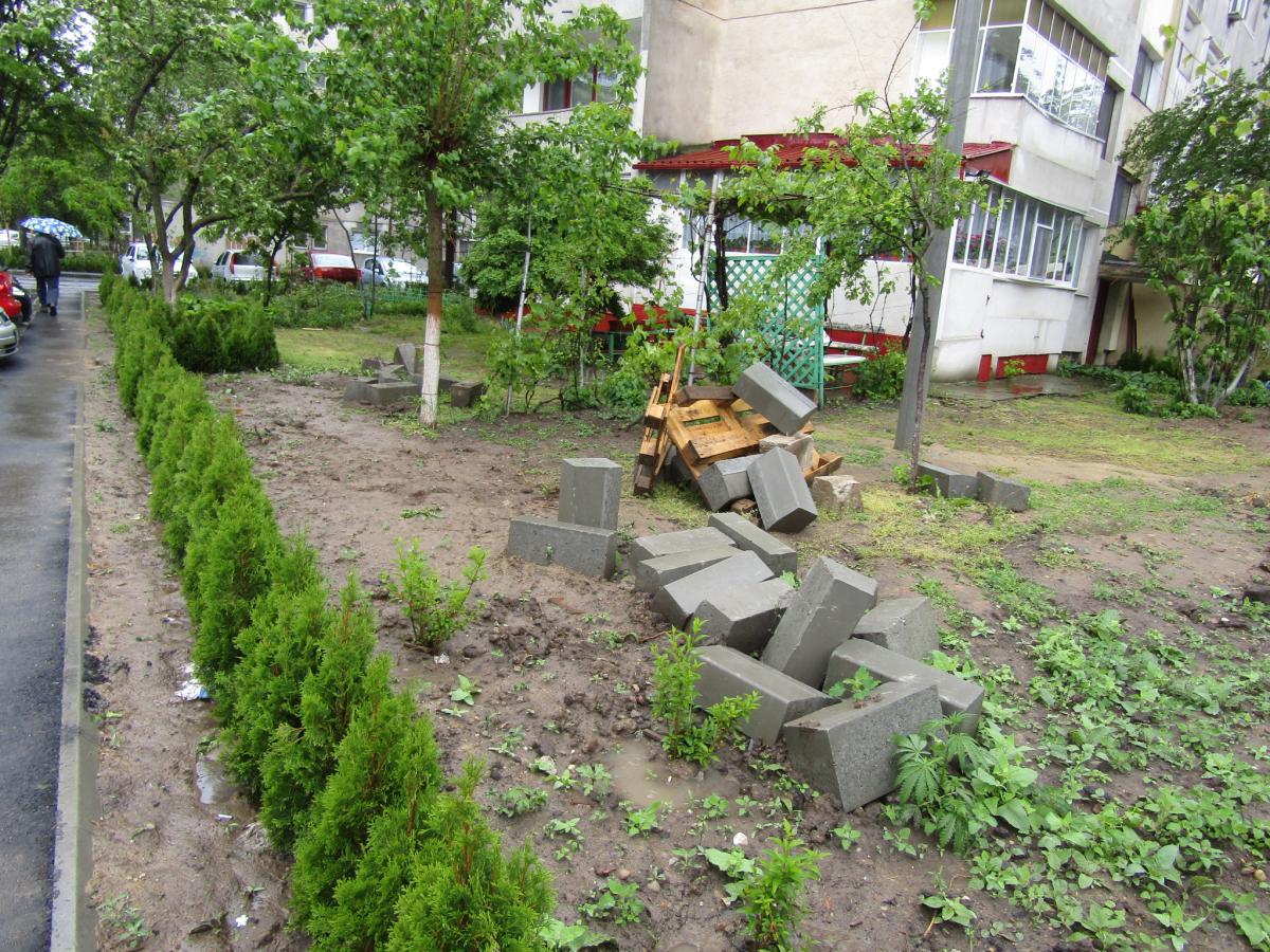 Şi nu ne aşteptam ca nici acum, după circa două luni de zile de la finalizarea parcării, constructorii să nu adune de pe spaţiul verde resturile rămase în urmă, precum borduri sau boxpaleţi din lemn, distruşi. Iar ceea ce se vede în spatele blocului se potriveşte exact cu proverbul “la chip păpuşă, la dos mătuşă”. Mai concret, după asfaltarea parţială a unei alei pietonale, a perimetrului pentru pubele şi a locului de bătut covoarele (distrus şi vechi din anii '60), tot au mai rămas unele aspecte nerezolvate, privind sistematizarea pe verticală: gropi în trotuar, şanţuri şi denivelări foarte mari, bucăţi din beton (aruncate drept stavilă spre un fost canal termic); plăci mari din beton peste un ditamai şanţul, spre a înlesni accesul, pe scurtătură, de către cei care distrug spaţiul verde; capace de canalizare acoperite tot cu plăci de beton şi alte surprize nedorite. Iar de câteva zile decorul este completat de un morman cu deşeuri inerte, o cadă, un wc şi alte materiale aduse aici noaptea, hoţeşte. Să reamintim şi faptul că, acolo unde s-a plantat gardul viu, pământul s-a transformat în noroi scurs pe trotuar. Spălat fiind, însă, de ultimele ploi. Şi aşa se întâmplă în multe locuri din oraş…