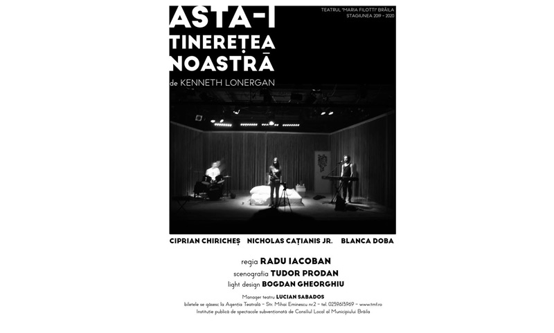 * duminică, 21 martie, de la ora 18.00, la Sala Mare se joacă spectacolul "Asta-i tinerețea noastră”, de Kenneth Lonergan, regia Radu Iacoban