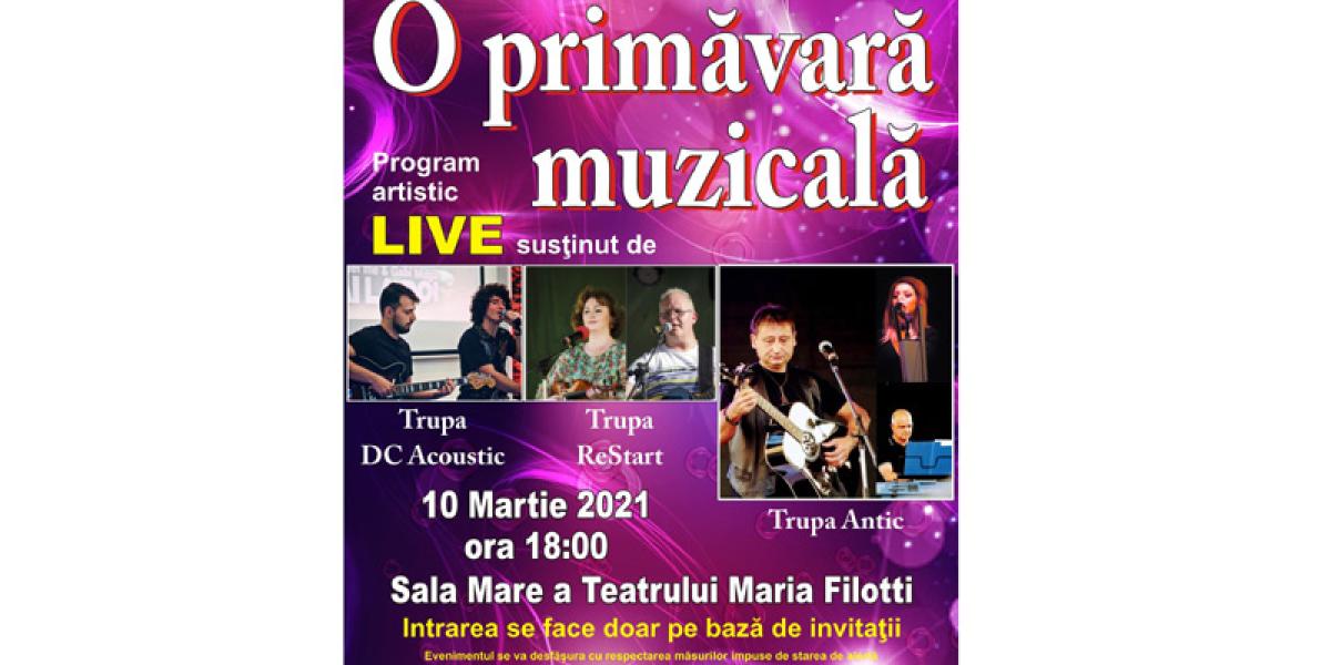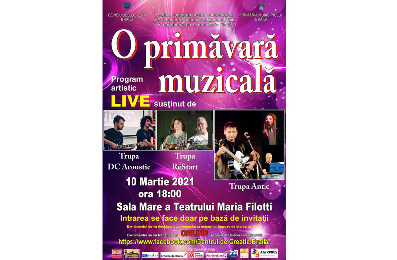 Consiliul Județean Brăila, cu sprijinul Primăriei Municipiului Brăila și Centrul Județean pentru Conservarea și Promovarea Culturii Tradiționale Brăila organizează în data de 10 martie 2021, ora 18.00, în Sala Mare a Teatrului Maria Filotti spectacolul artistic "O primăvara muzicală". De asemenea, evenimentul va fi transmis live pe pagina de Facebook a organizatorului – Centrul.de.Creatie.Braila