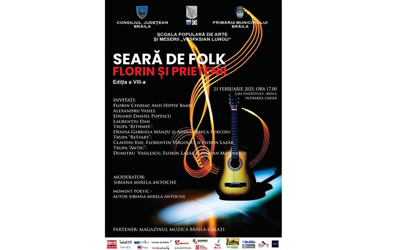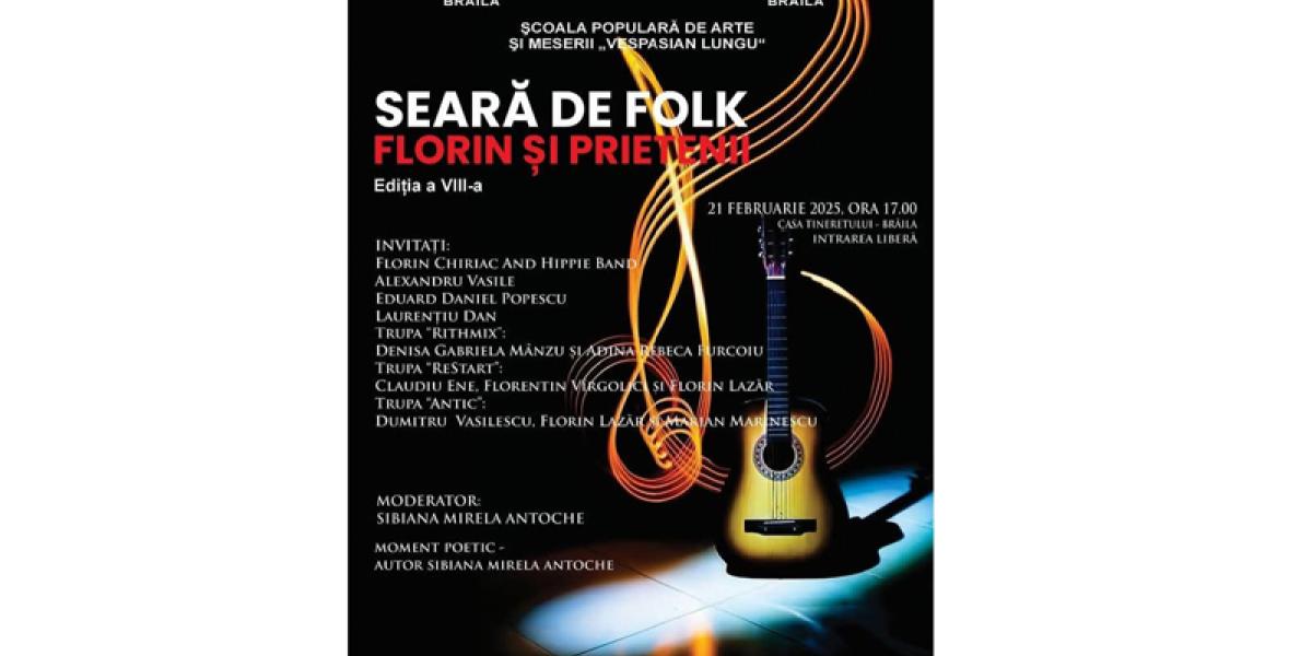 Iubitorii de muzică Folk sunt așteptați la o seară de excepție, pusă în scenă la Casa Tineretului Brăila, vineri, 21 februarie, începând cu ora 17.00. Este vorba despre «Seară de Folk: Florin și Prietenii», eveniment ajuns la Ediția aVIII-a, coordonat de prof. de chitară Florin Lazăr, de la Școala de Arte ”Vespasian Lungu” Brăila, iar intrarea este liberă.