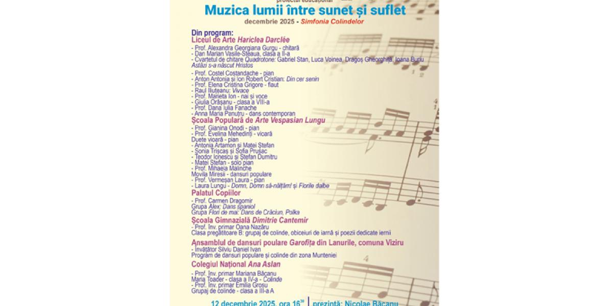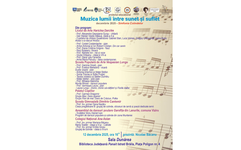 „Vă propunem o seară dedicată colindelor românești vineri, 12 decembrie, începând cu ora 16:30. Spectacolul este susținut de elevii și profesorii coordonatori de la Liceul de Artă „Hariclea Darclee”, Școala Populară de Arte „Vespasian Lungu”, Palatul Copiilor Brăila, Școala Gimnazială „Dimitrie Cantemir”, Ansamblul de dansuri populare „Garofița” din satul Lanurile, comuna Viziru și Colegiul Național „Ana Aslan” Brăila”, precizează organizatorii evenimentului.