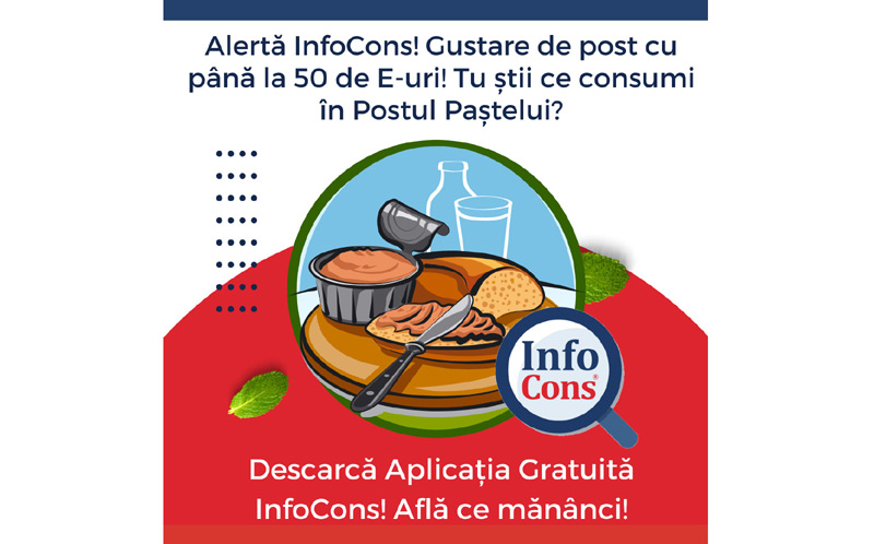 Acum, în plin Post al Paștelui, InfoCons vine în sprijinul consumatorilor cu informații despre numărul de aditivi alimentari, cantitatea de zahăr, cantitatea de sare, proveniența ingredientului principal etc din produsele ce vor fi consumate, cu preponderență, în post.