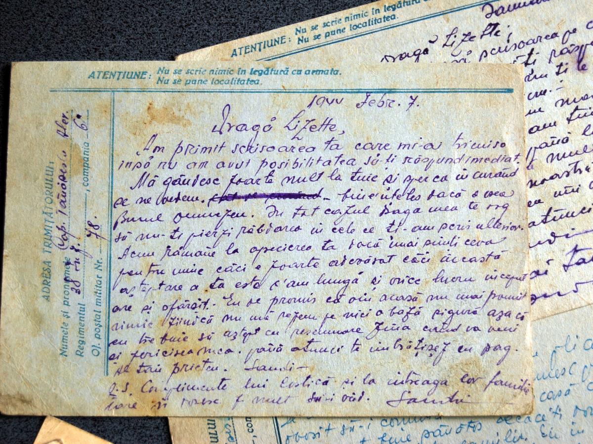 Aflându-se pe front, militarul Alex Tănăsescu nu putea coresponda cu iubita sa prin intermediul unor scrisori închise în plic, ci doar prin cărţi poştale scrise la vedere, pe care nu avea voie să menţioneze locul unde se află şi nici alte detalii legate de armată. Cărţile poştale erau expediate gratuit, purtând obligatoriu ştampila cenzurii militare. Citindu-le, nu aflăm decât amănunte legate de starea de sănătate şi de spirit a expeditorului. Acesta are grijă de fiecare dată să dea asigurări că “este bine”, le doreşte şi celor de acasă acelaşi lucru, iar femeii iubite îi spune periodic, cel puţin în partea de început a corespondenţei, cât de mult îi lipseşte şi cât aşteaptă ziua când se vor revedea. Anii lungi de război şi-au spus, însă, cuvântul, iar răbdarea iubitei, greu pusă la încercare de aşteptarea prelungită, pare să fi dus la un deznodământ nu tocmai fericit pentru relaţia celor doi.