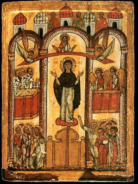 "Astăzi, poporul cel binecredincios luminat prăznuim, umbriţi fiind prin venirea ta, Maica Lui Dumnezeu, şi căutând către Preacinstita Icoana ta cu umilinţă grăim: acoperă-ne pe noi cu Cinstitul tău Acoperământ şi ne scapă de tot răul, rugând pe Fiul tău Hristos, Dumnezeul nostru, să mântuiască sufletele noastre.
