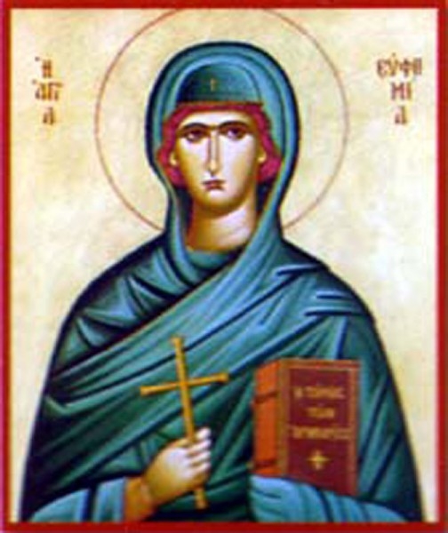 Sfânta Muceniţă Eufimia mai este prăznuită pe 11 iulie, când facem pomenirea minunii petrecută la sfintele sale moaşte. Pentru a se descoperi dacă învăţătura cu privire la cele două firi din Hristos este adevărată, Sfinţii Părinţi au scris într-o carte dreapta credinţă - în Hristos sunt două firi, unite într-un mod neamestecat, neschimbat, neîmpărţit şi nedespărţit - şi ereticii şi-au scris într-o altă carte învăţătura lor, şi le-au pus pe amândouă pe pieptul Sfintei Eufimia. După puţine zile, au deschis din nou racla şi au văzut că la picioarele sfintei se afla cartea ereticilor, iar cea a Sfinţilor Părinţi era în mâinile ei.