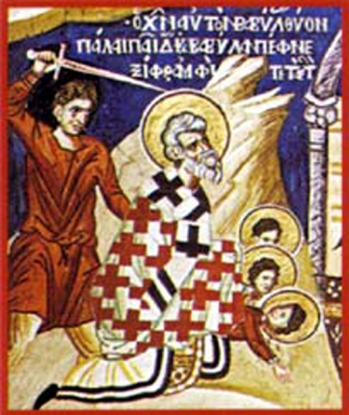 La acea vreme, în timpul şederii sale în Antiohia, împăratul a organizat o mare sărbătoare în cinstea zeilor. Episcopul Vavila slujea Sfânta Liturghie în biserică şi se ruga pentru creştini, când a auzit că însuşi Decius vrea să intre în sfântul ăcaş, curios să cunoască Sfintele Taine şi să profaneze lăcaşul Domnului.
