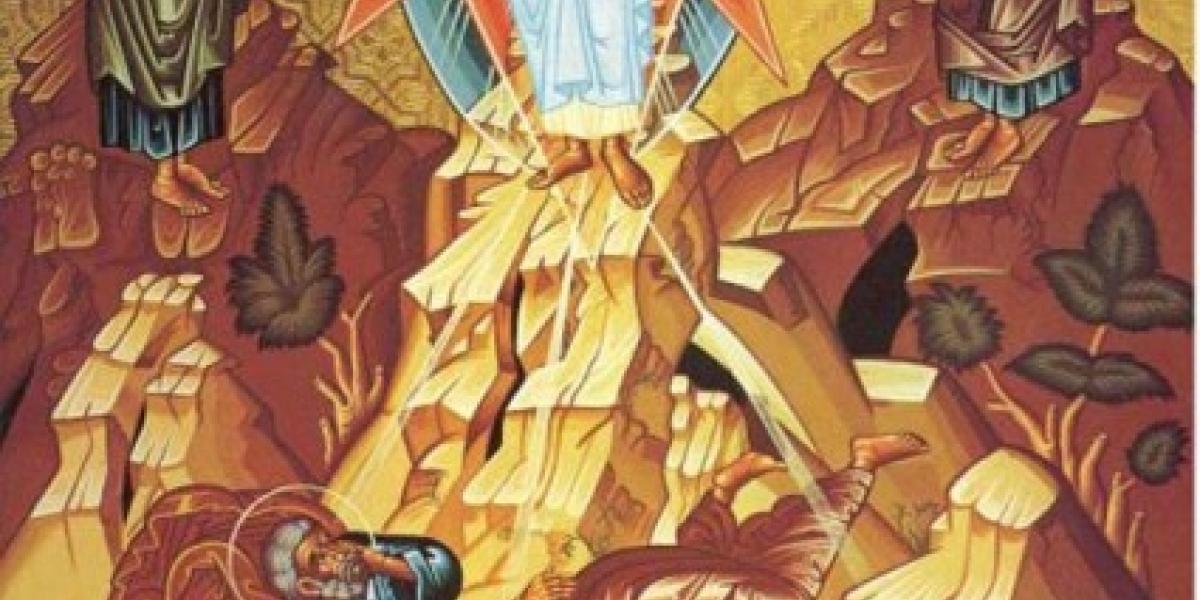 Şi iată, Moise şi Ilie s-au arătat lor, vorbind cu El. Şi răspunzând, Petru a zis Lui Iisus: Doamne, bine este să fim aici; dacă voieşti, voi face aici trei colibe: Ţie una, lui Moise una şi lui Ilie una. Vorbind el încă, iată un nor luminos i-a umbrit pe ei şi iată glas din nor zicând: "Acesta este Fiul Meu cel iubit; pe Acesta ascultaţi-L". Şi, auzind, ucenicii au căzut cu faţa la pământ şi s-au spăimântat foarte." (Matei 17, 2-6; text paralel Marcu 9, 2-7; Luca 9, 28-36).