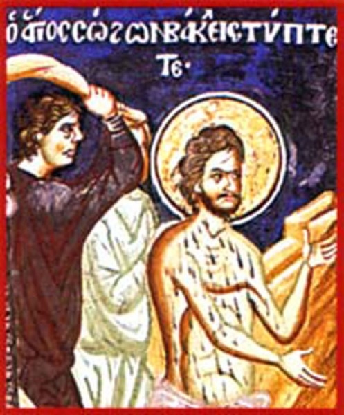 Auzind aceasta, ighemonul a poruncit să fie torturat: l-au spânzurat şi cu drugi de fier l-au strujit; apoi încălţându-l cu încălţăminte de fier care avea piroane pe dinăuntru, l-au pornit prin cetate. Dar sfântul Îl slăvea pe Hristos. Şi iarăşi îl spânzurară pe lemn şi cu toiege de fier îl bătură, iar sfântul şi-a dat duhul în mâinile Lui Dumnezeu.