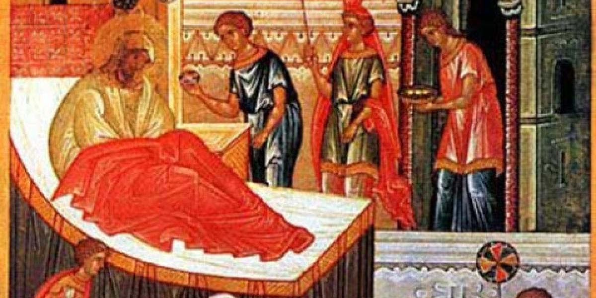 Domnul, Cel ce locuieşte în cer, vrând să Se arate pe pământ şi să vieţuiască cu oamenii, mai întâi a pregătit loc de sălăşluirea slavei Sale, pe Preacurata Maica Sa. Preacurata Fecioară era, după tată, din neam împărătesc, iar după mamă din neam arhieresc. Tatăl Sfintei Fecioare, Ioachim, se trăgea din neam împărătesc, iar pe mama sa o chema Ana. Cu toate că-şi ducea, mai mult decât alţii, la Dumnezeu, darurile de mulţumire - ca un iubitor de Dumnezeu şi credincios bogat ce era - pentru nerodire Ioachim era defăimat, căci şi el şi soţia lui erau sterpi şi nu aveau copii. De aceea, mâhnindu-se la inimă (el în munte, iar soţia Ana în grădină), se rugau cu lacrimi Lui Dumnezeu, Care, ascultându-le ruga, le-a dat rod sfânt pântecelui, pe Preasfânta Născătoare de Dumnezeu şi Pururea Fecioară Maria.