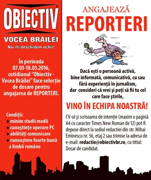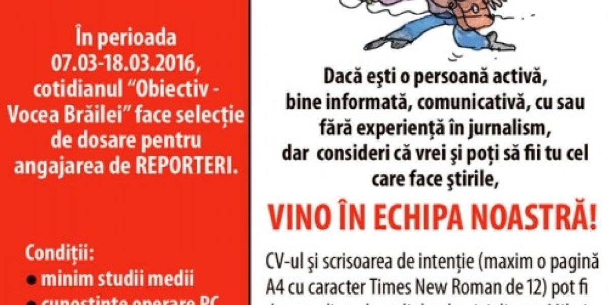 În perioada 07.03 - 18.03. 2016, cotidianul "Obiectiv - Vocea Brăilei" face selecţie de dosare pentru angajarea de reporteri.