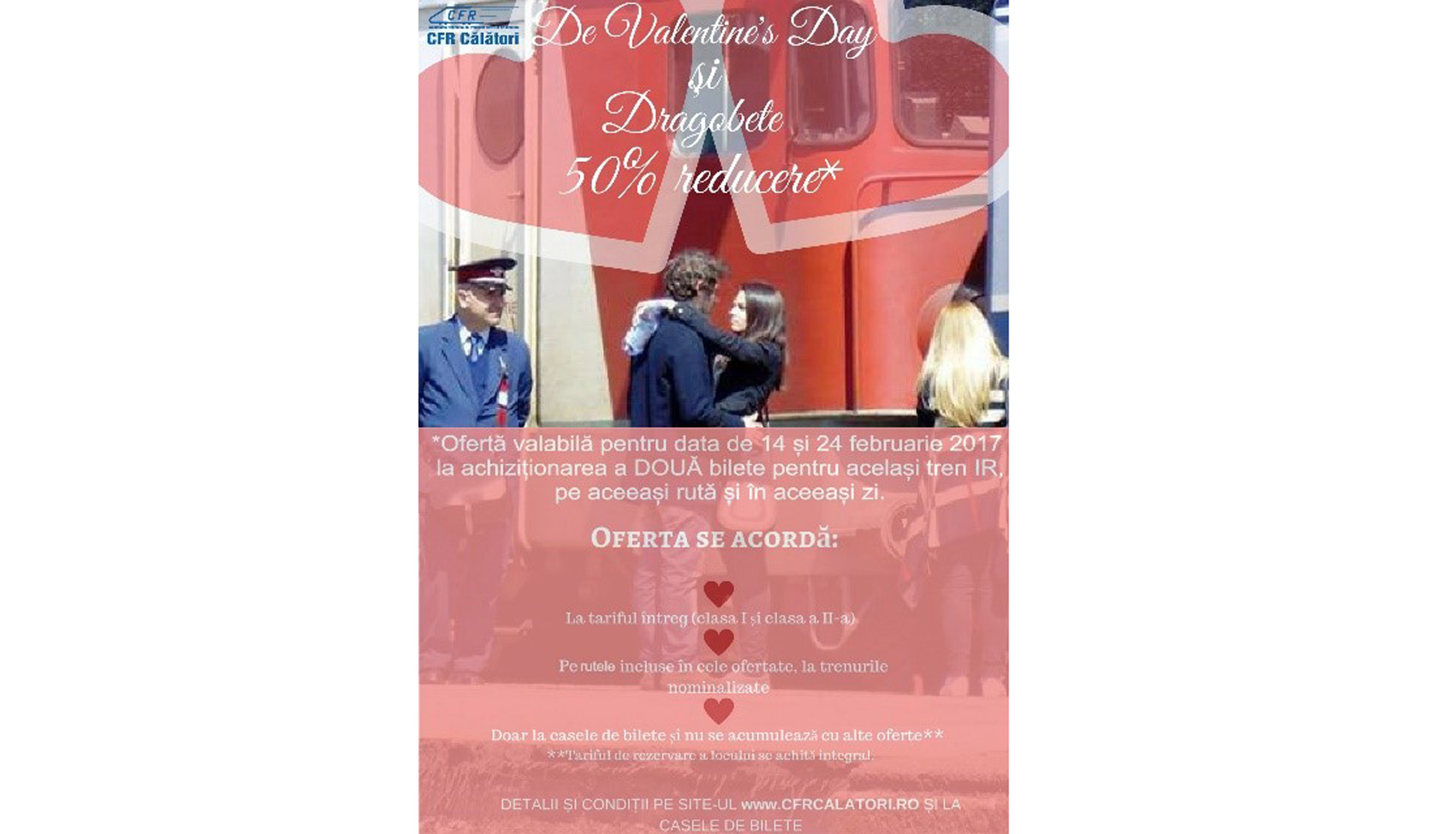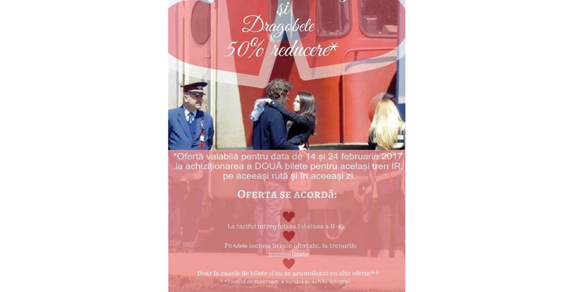 În luna în care care se celebrează dragostea, CFR Călători pune în vânzare bilete la jumătate de preţ pentru zilele de 14 şi 24 februarie 2017: „IR Special / Oferta pentru 2”. Reducerea de 50% din tariful biletului întreg este valabilă pentru călătoria la clasa 1 şi a 2-a, se acordă la achiziţionarea a două bilete pentru acelaşi tren InterRegio şi este disponibilă exclusiv la casele de bilete din staţiile CFR.