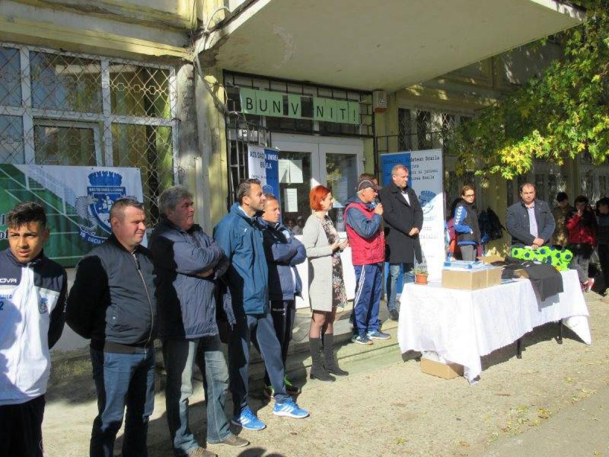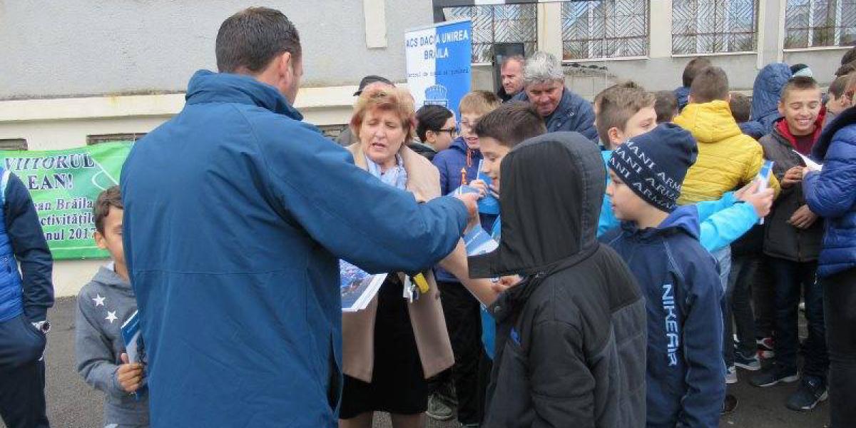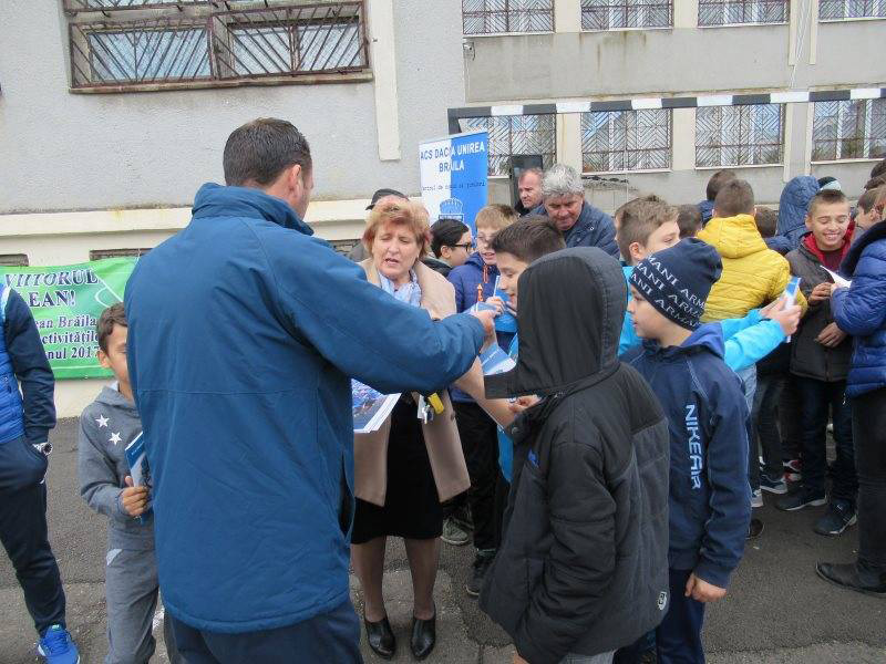 Oficialii clubului fanion al oraşului Brăila au oferit elevilor prezenţi echipamente de joc, mingi de fotbal, rechizite şi postere cu echipa de seniori.