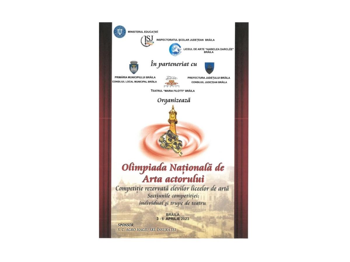 Pentru a treia oară în ultimii 10 ani, județul Brăila găzduiește Olimpiada Națională de Arta Actorului! Competiția se desfășoară în perioada 3-6 aprilie, fiind organizată de Ministerul Educației, prin Inspectoratul Școlar Județean Brăila și Liceul de Arte “Hariclea Darclee”, în parteneriat cu Teatrul ”Maria Filotti”, Primăria Municipiului Brăila și Consiliul Județean Brăila.