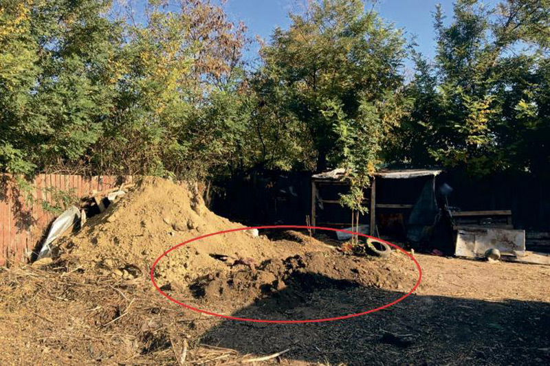 Cadavrul tranșat pentru a putea fi ascuns. Picioarele îngropate la mică adâncime
